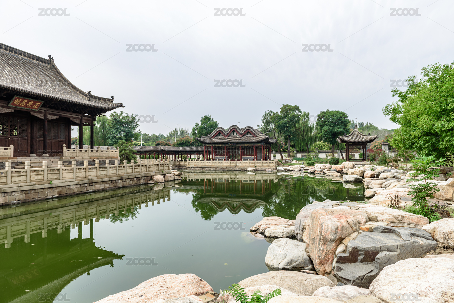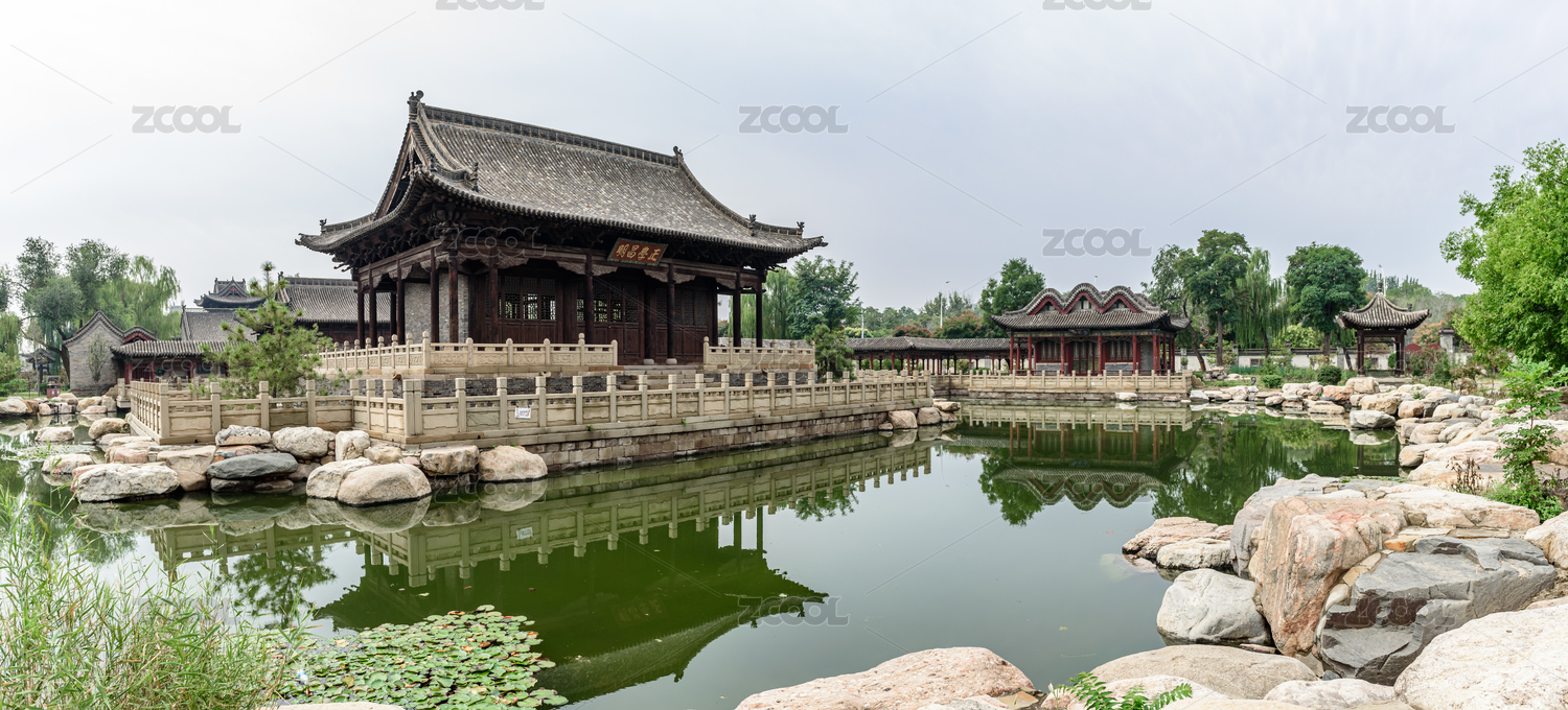 山西省晋中市榆次老城内西花园古建池塘风光