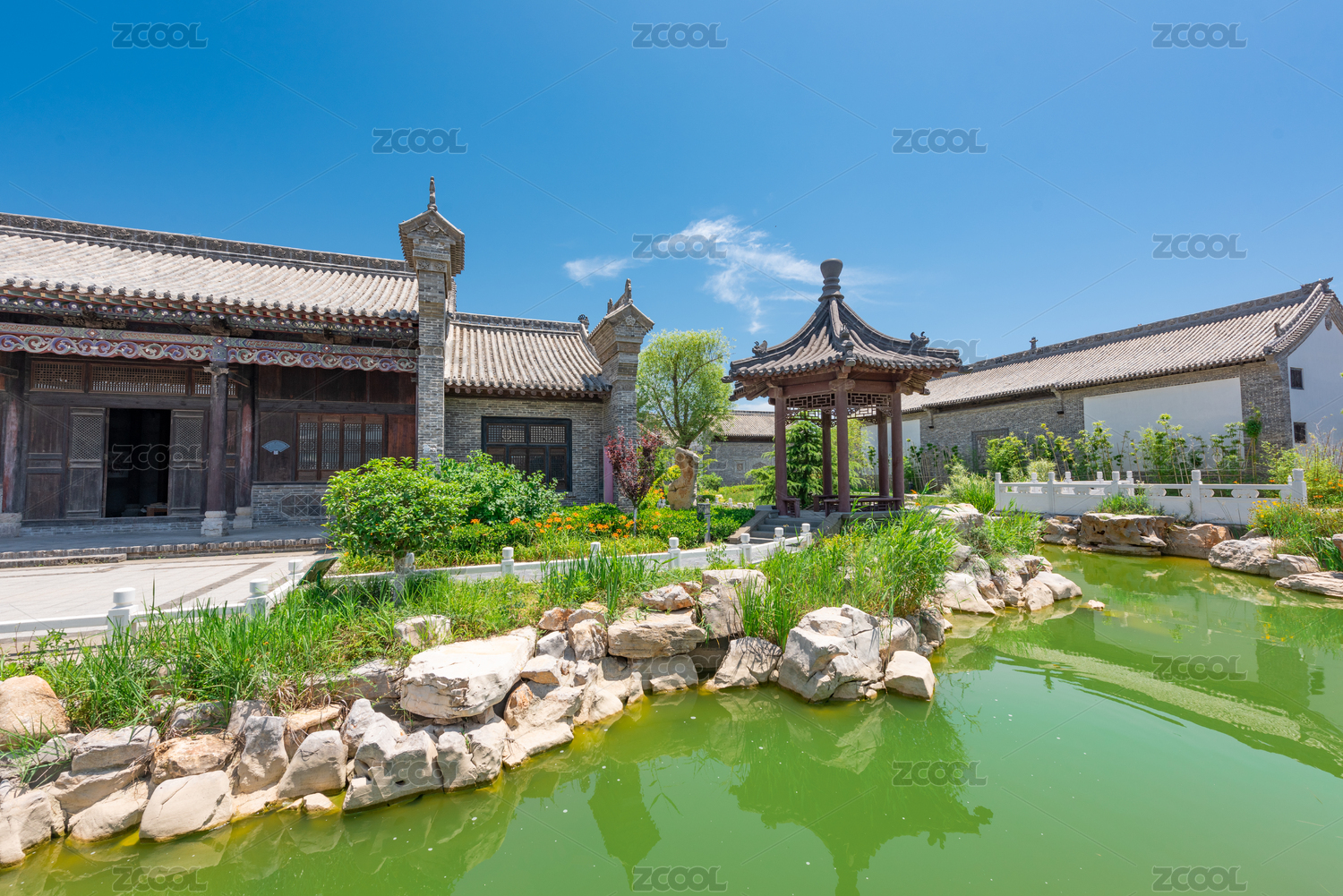中国山西省祁县乔家大院花园水池园林建筑