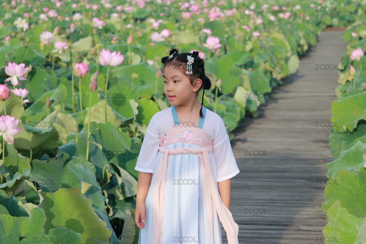 在荷塘边欣赏荷花的女孩