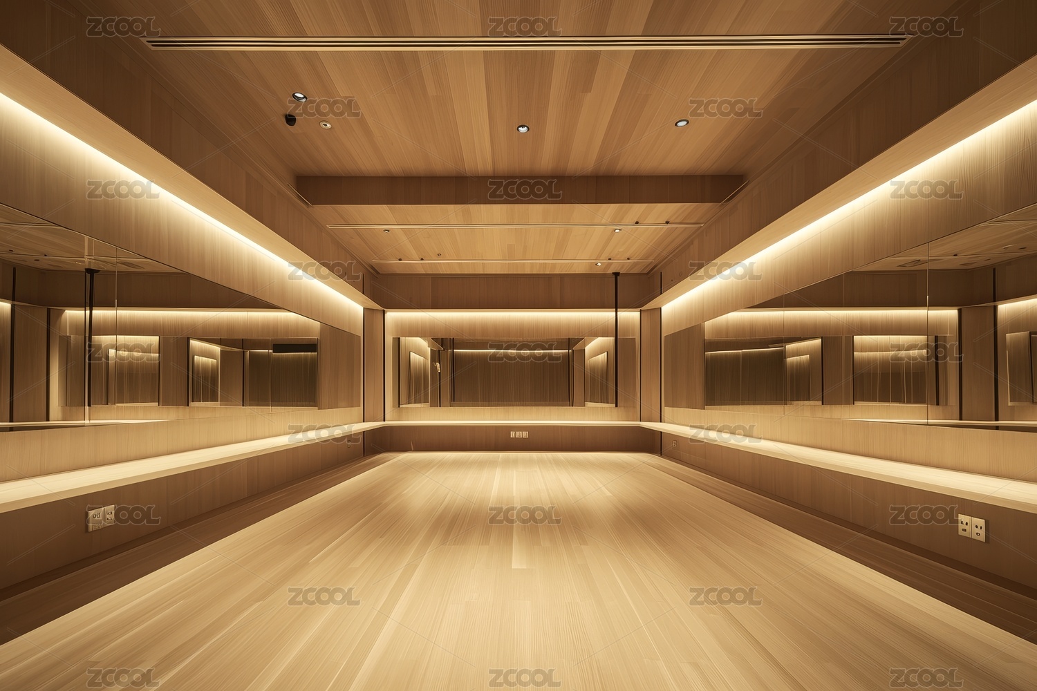 无人的建筑走廊木质墙壁和灯光
