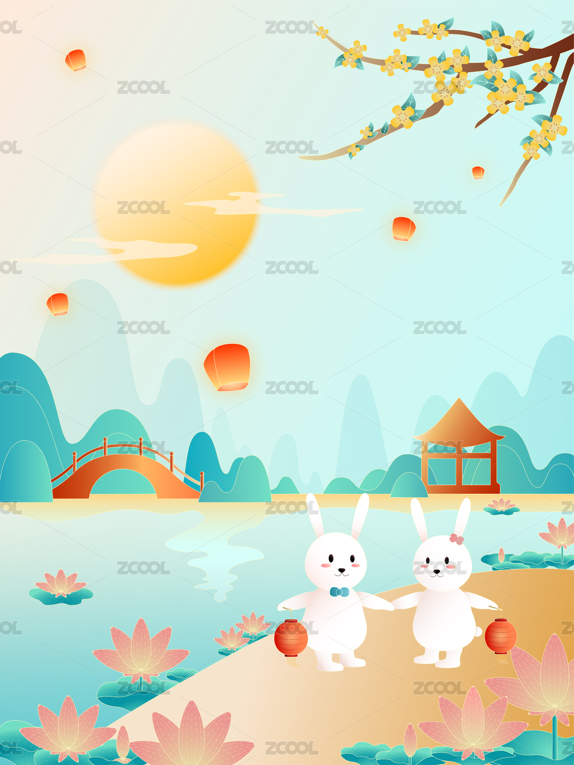 七夕中秋节国潮插画海报荷塘兔子提灯笼赏月