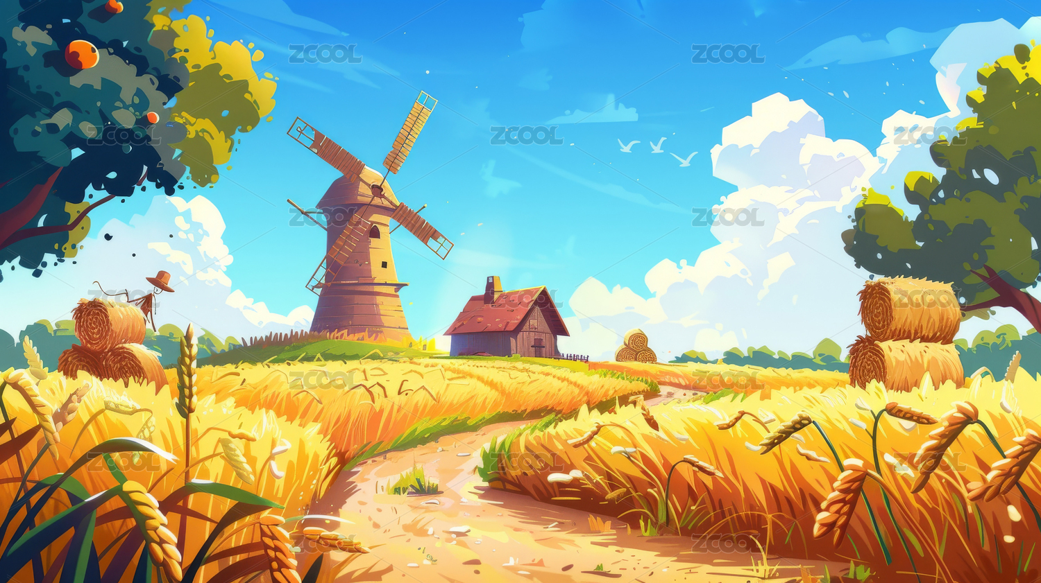 房子,麦田,蓝天,白云,太阳,光线,树木,绿叶,旗帜,建筑
