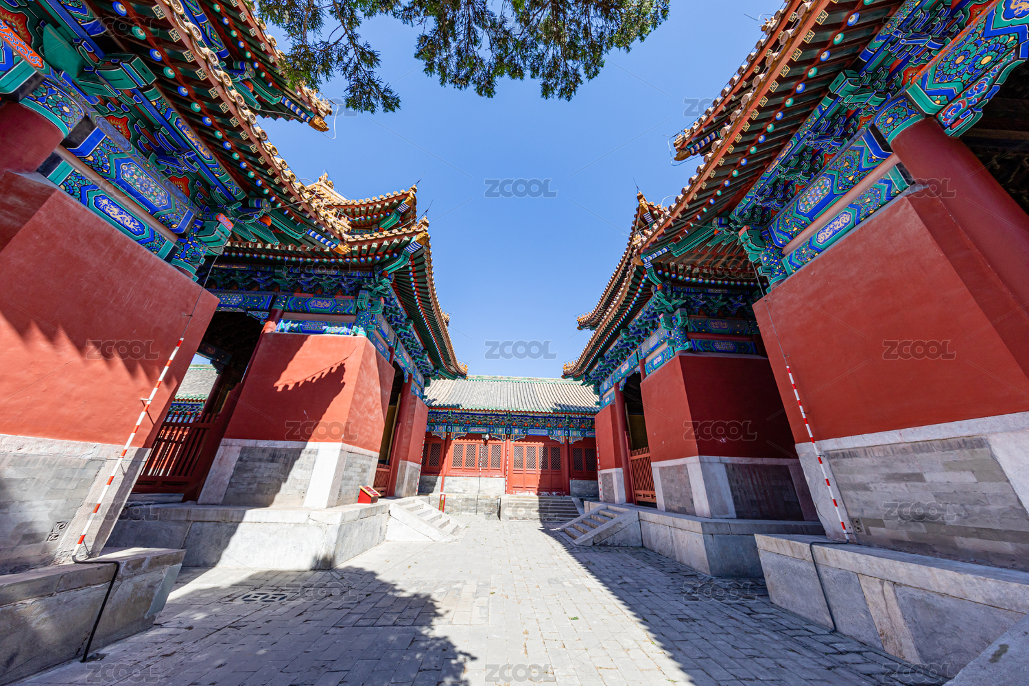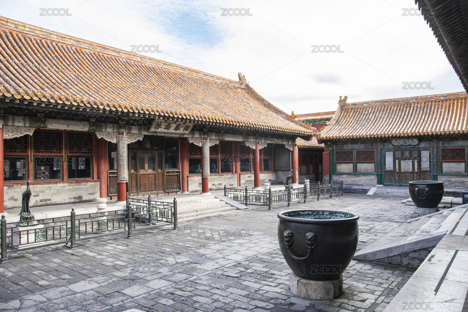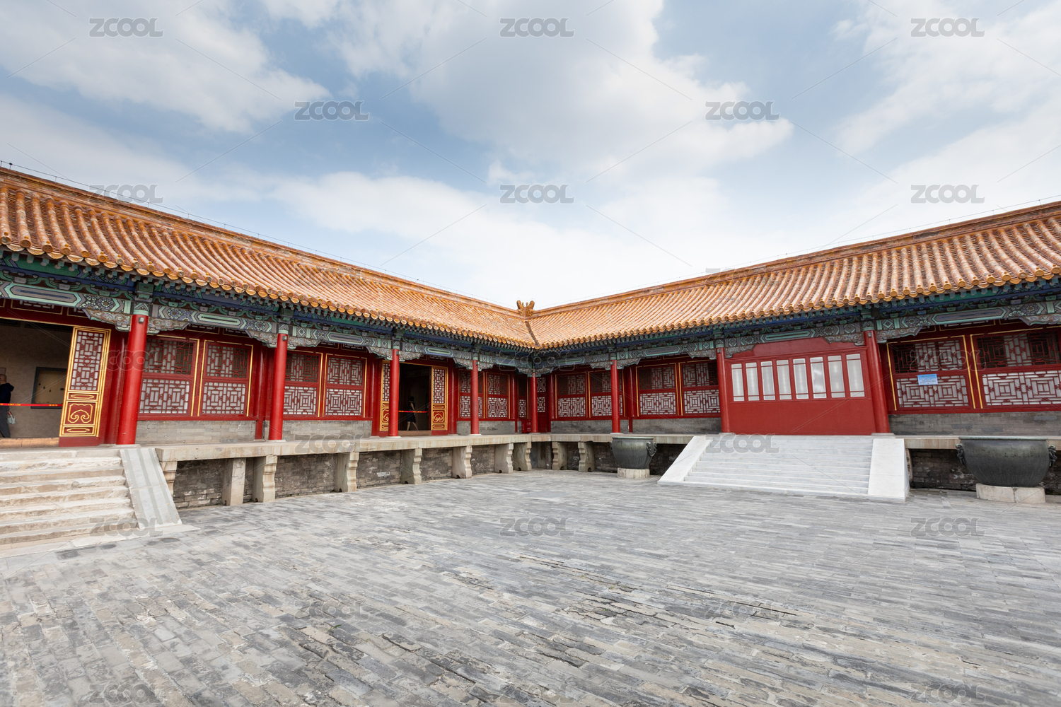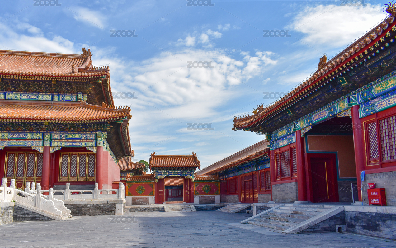 蓝天白云背景下中国北京故宫宫殿广场一角