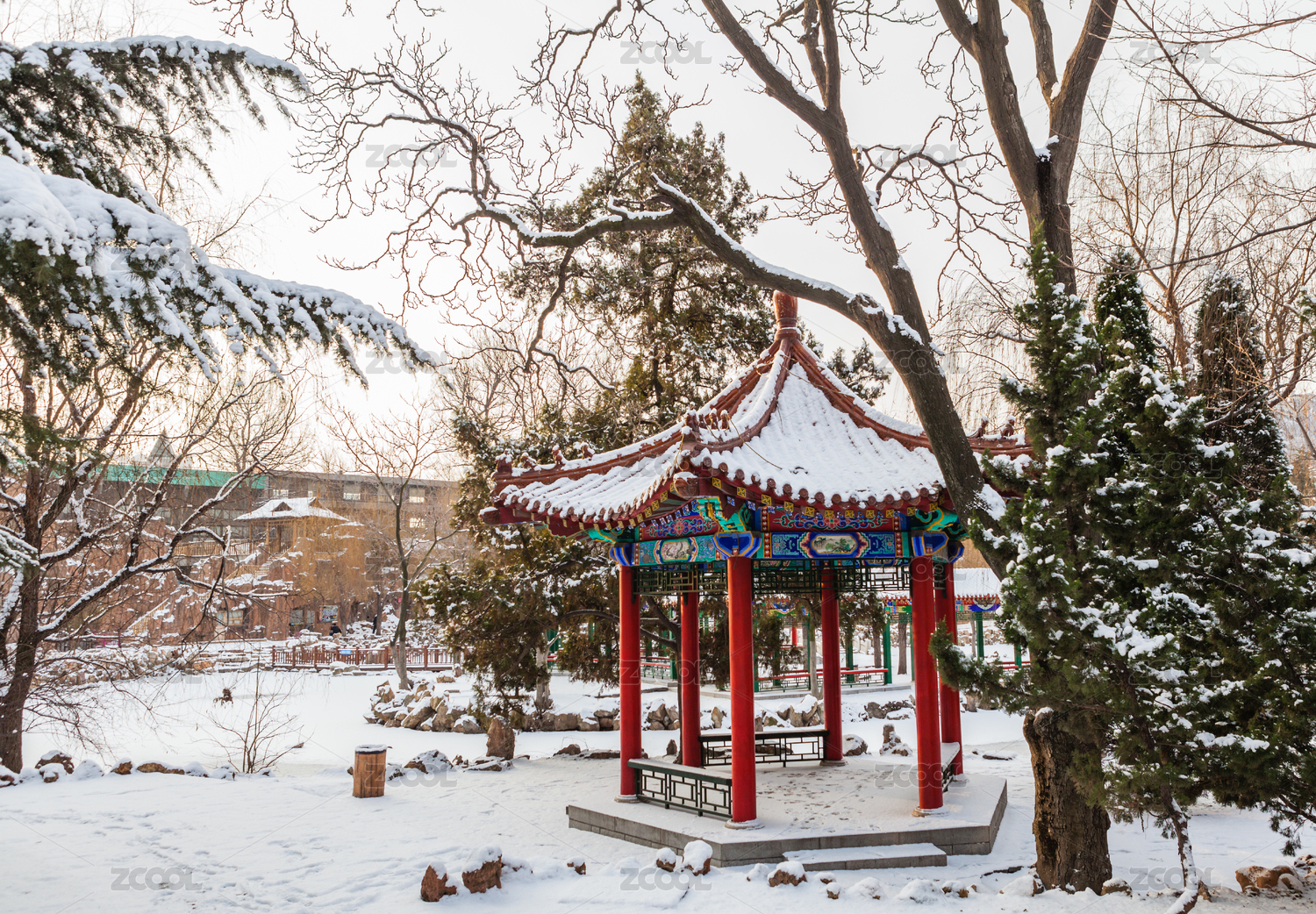 冬季雪后中国辽宁沈阳清昭陵的凉亭