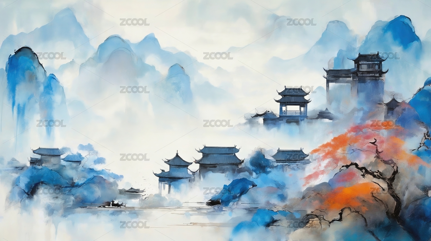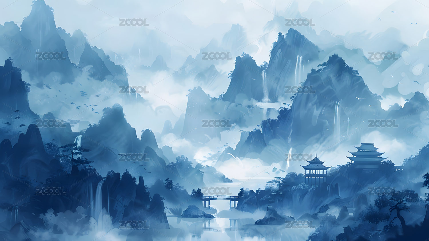 单色蓝色水墨中国风建山水云雾插画壁纸场景