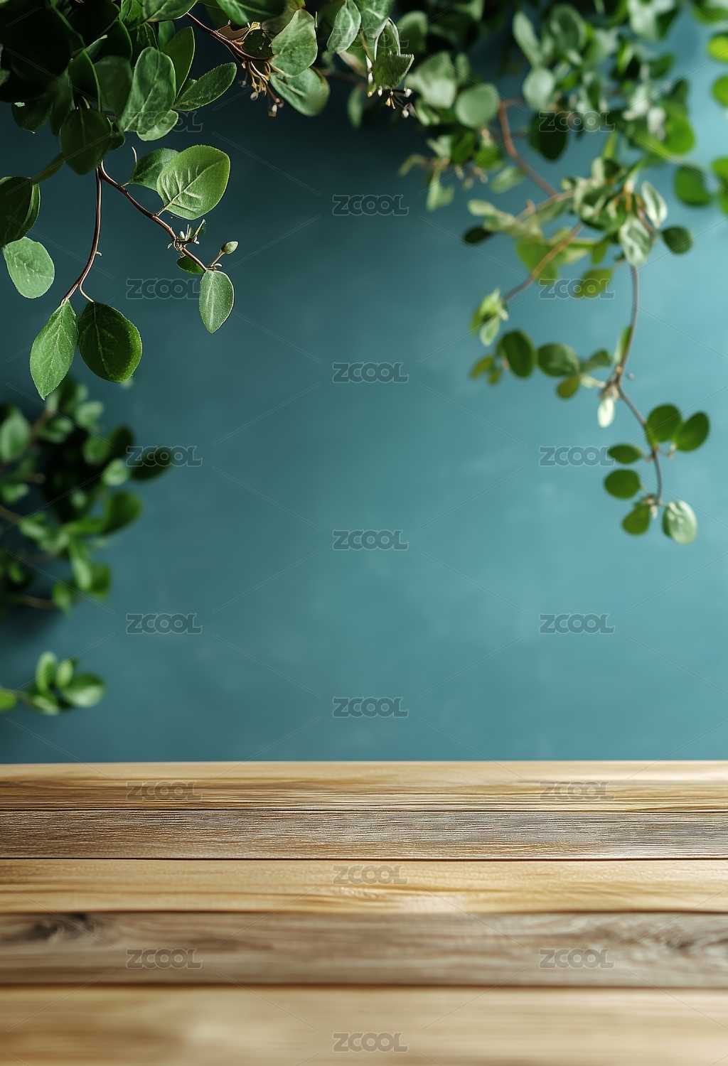 木质桌面与绿叶装饰背景