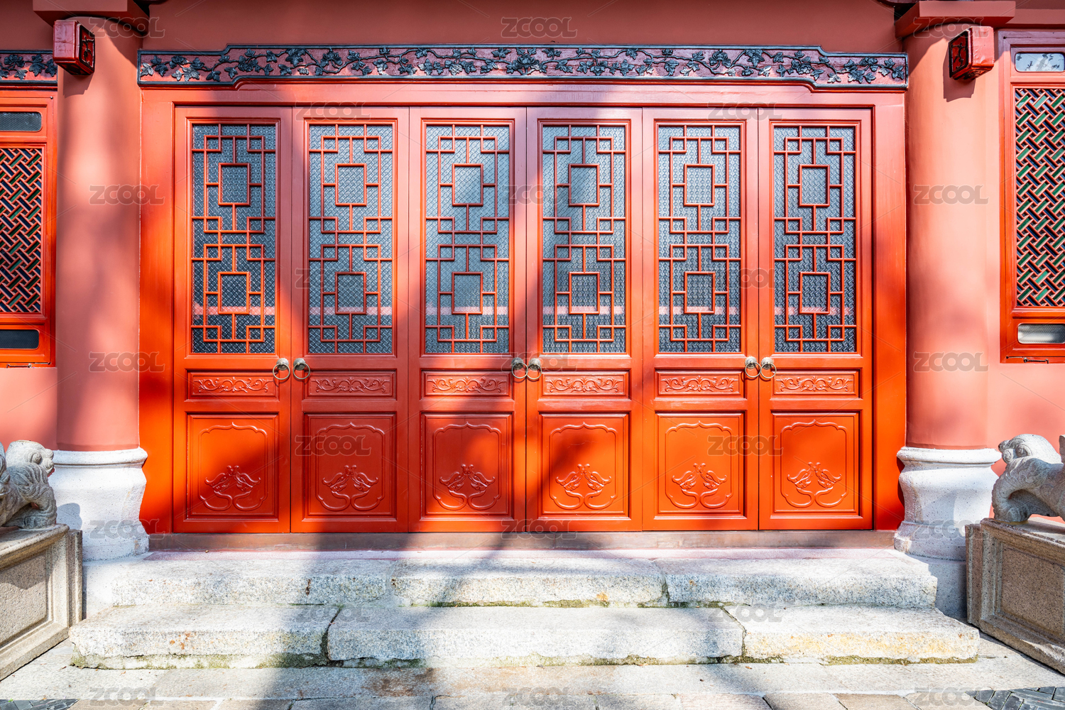 中式风格建筑物的红色镂空木门