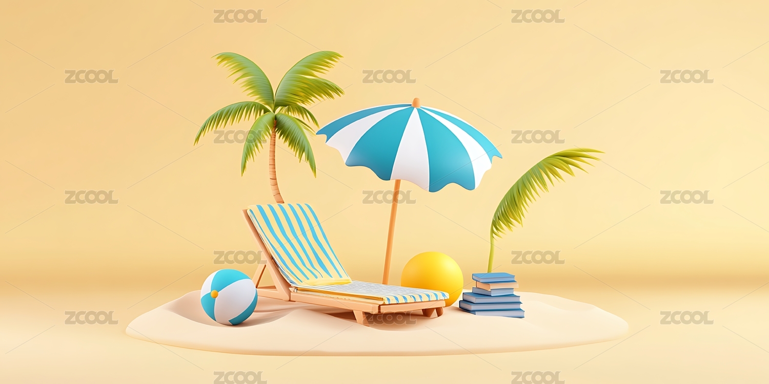海边度假主题,3D沙滩休闲椅遮阳伞