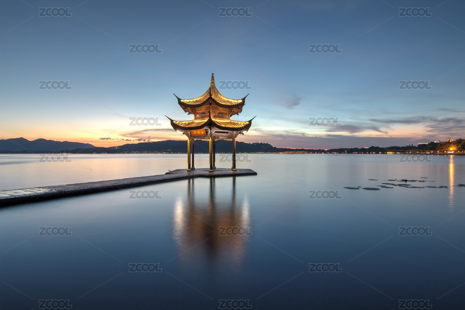 杭州,西湖,集贤亭,慢门,湖水,平静,倒影,灯光,亭子,古亭