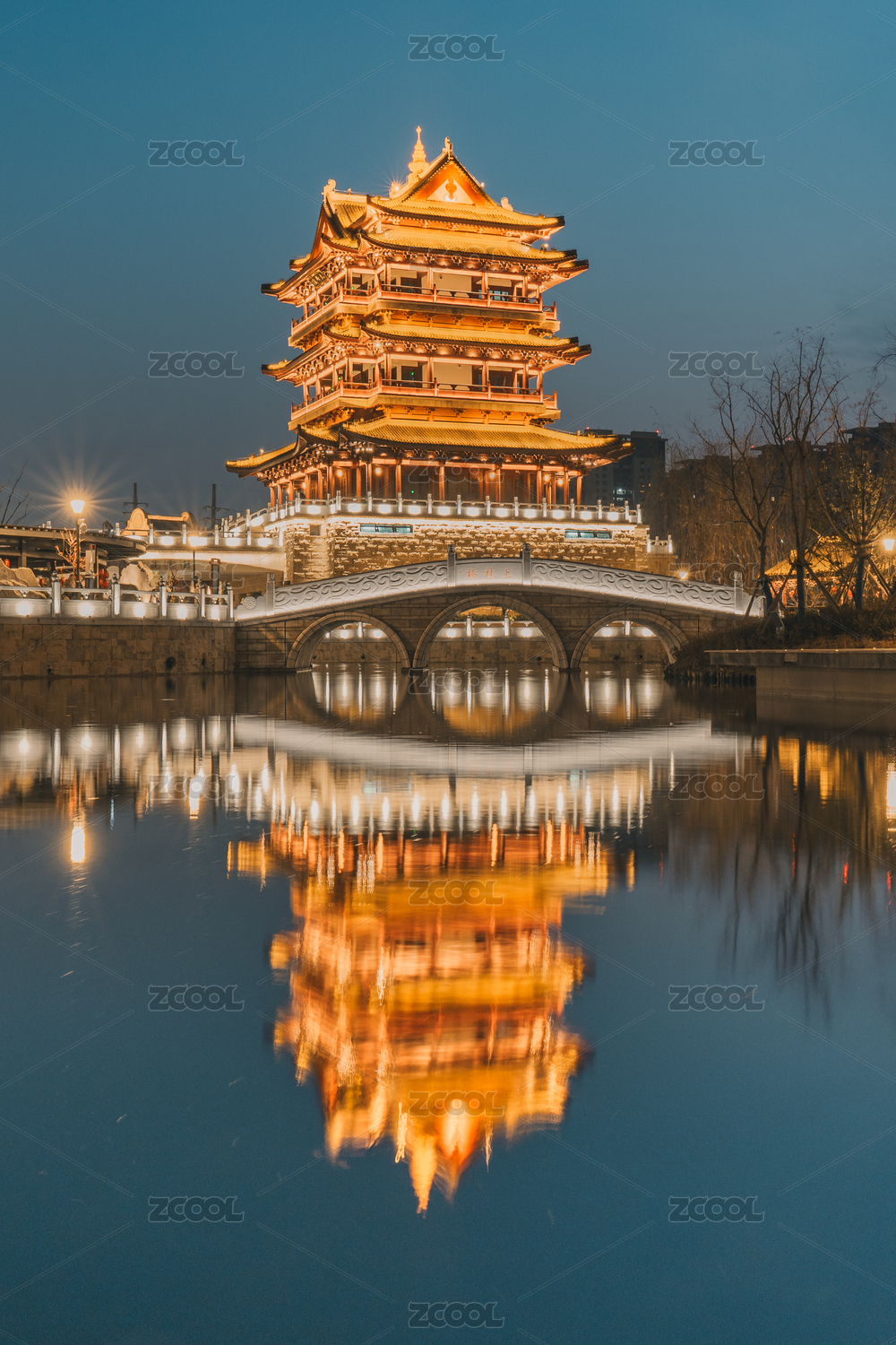 中国四川成都东安湖体育公园东安阁美丽夜景