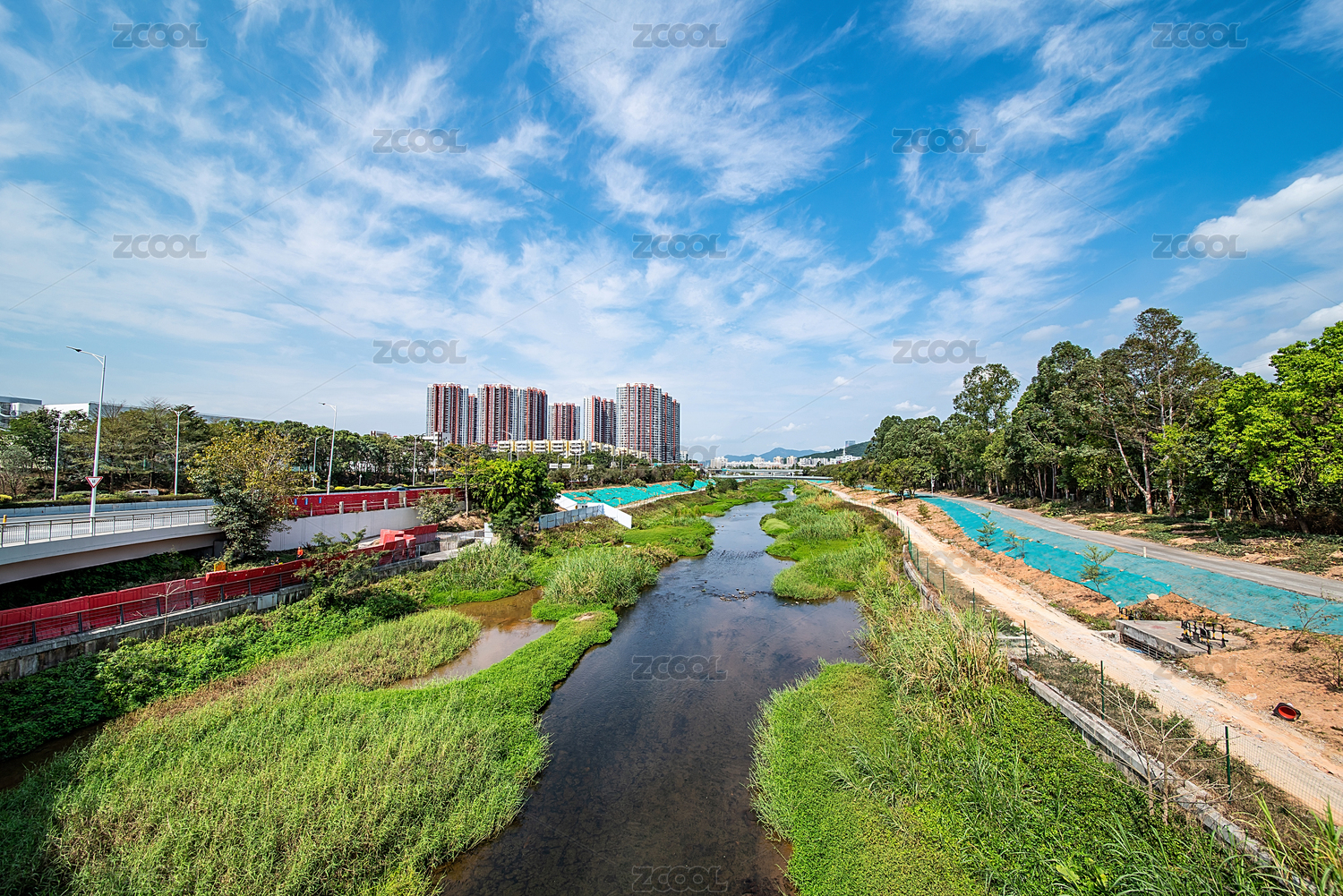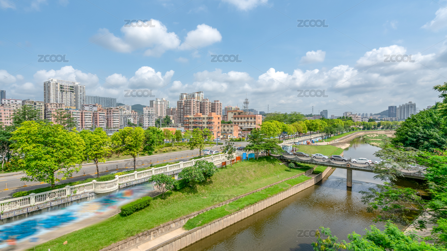 深圳坪山河公园蓝天白云下的河畔景观