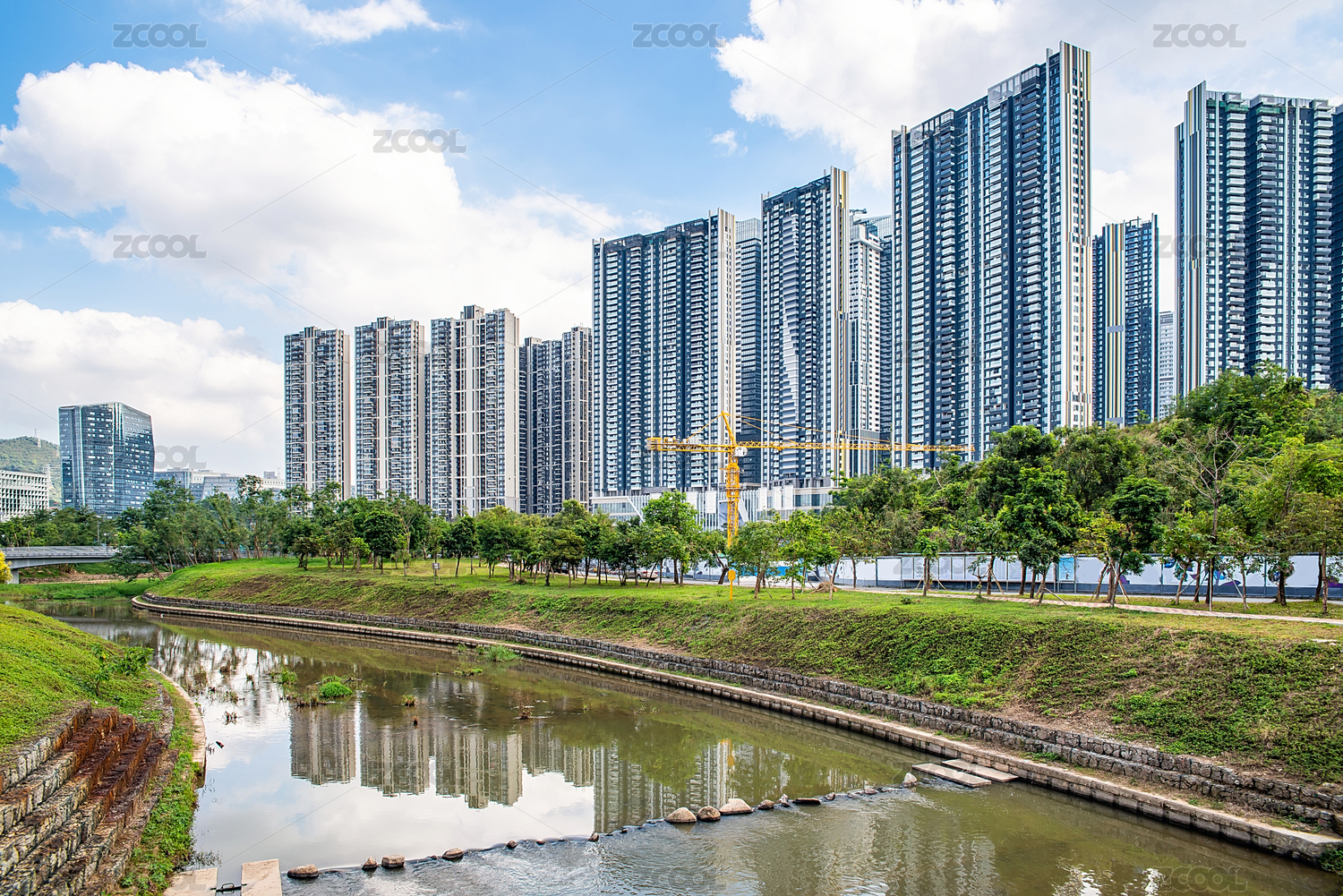 美丽的河畔水岸高层住宅小区环境背景素材