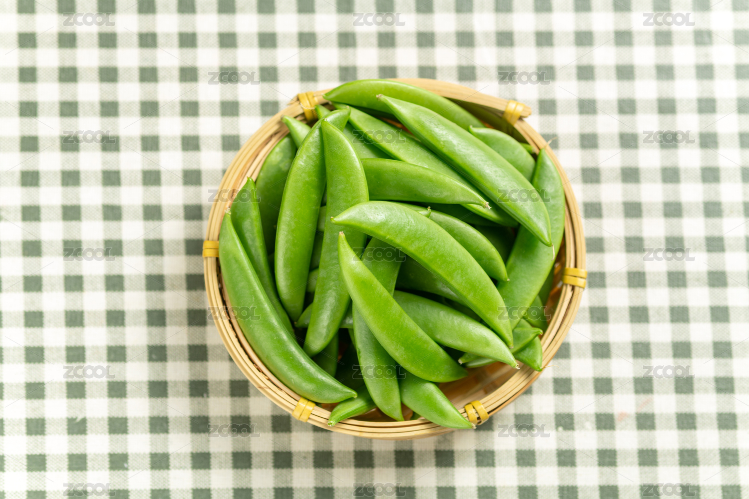 浅绿背景上的一竹筛子新鲜豆荚蔬菜甜豆海报背景素材