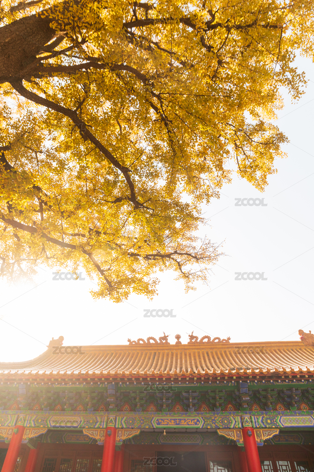 山东济南淌豆寺秋天黄色千年银杏树叶子金黄