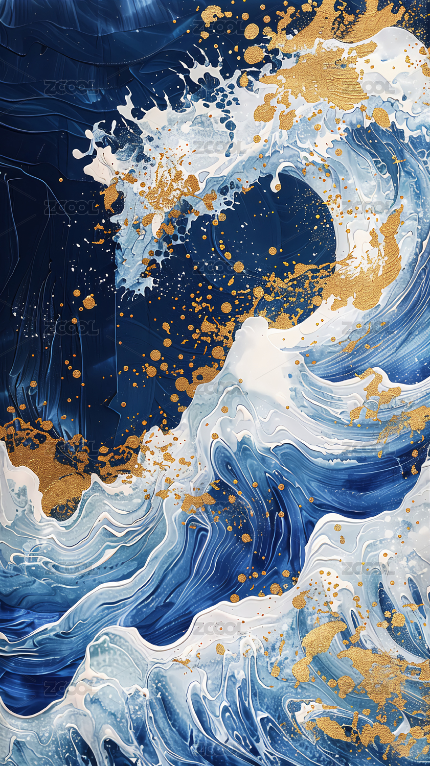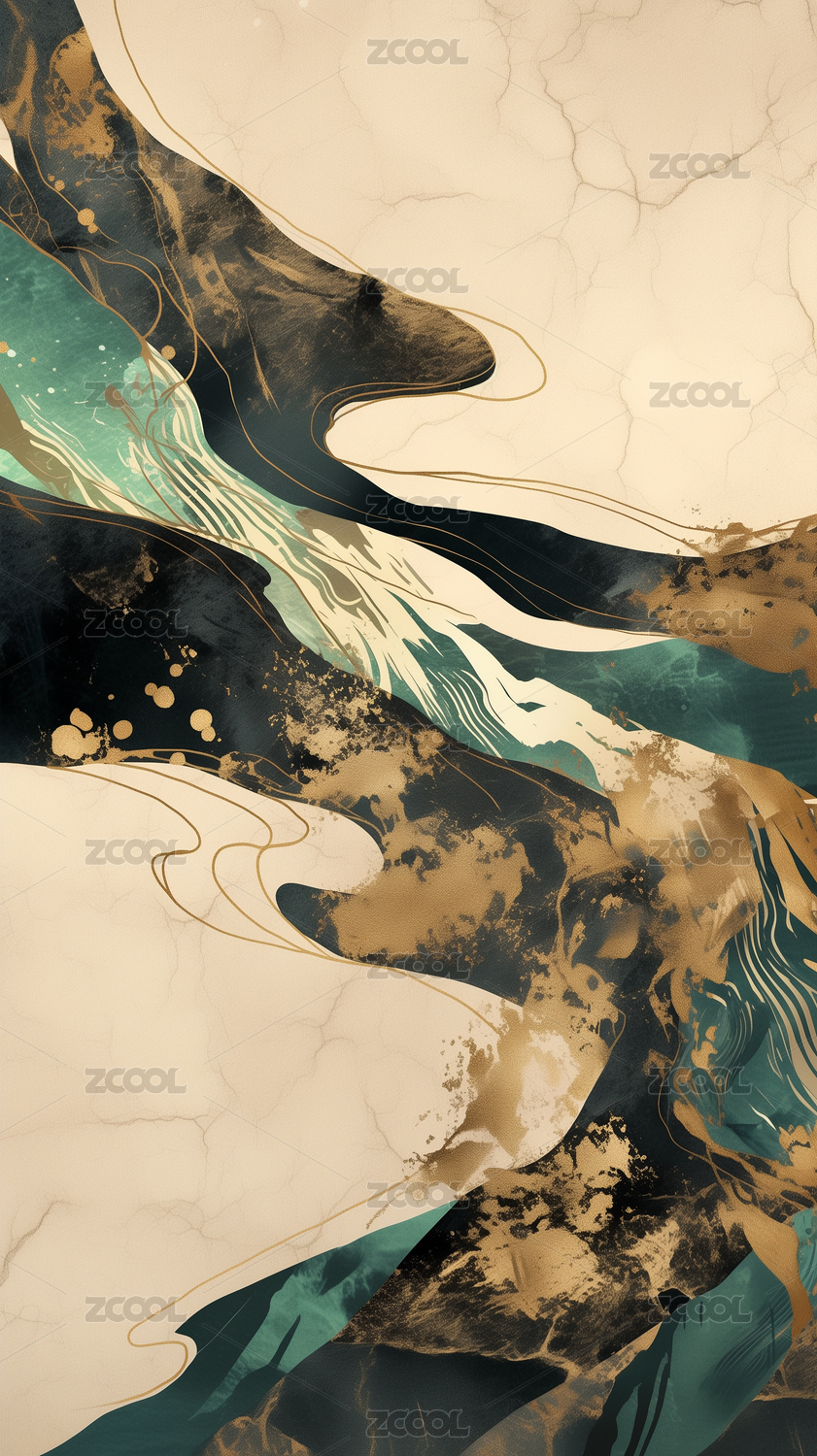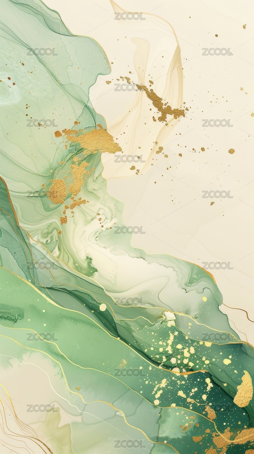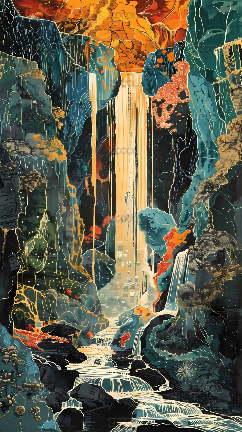 国风金色绿色从山崖飞落的瀑布插画绘画水墨