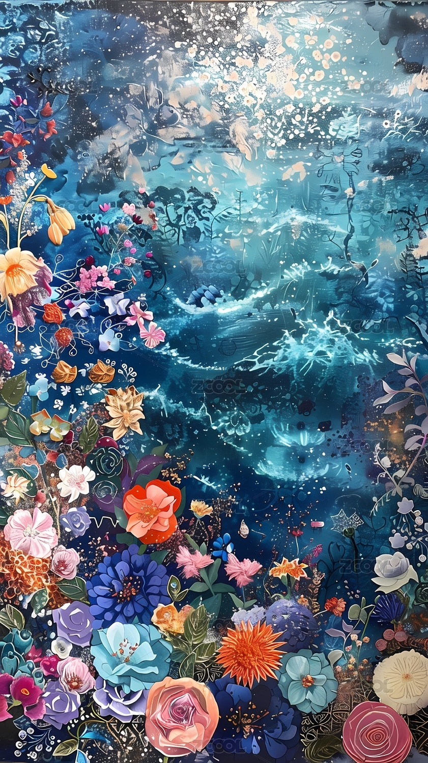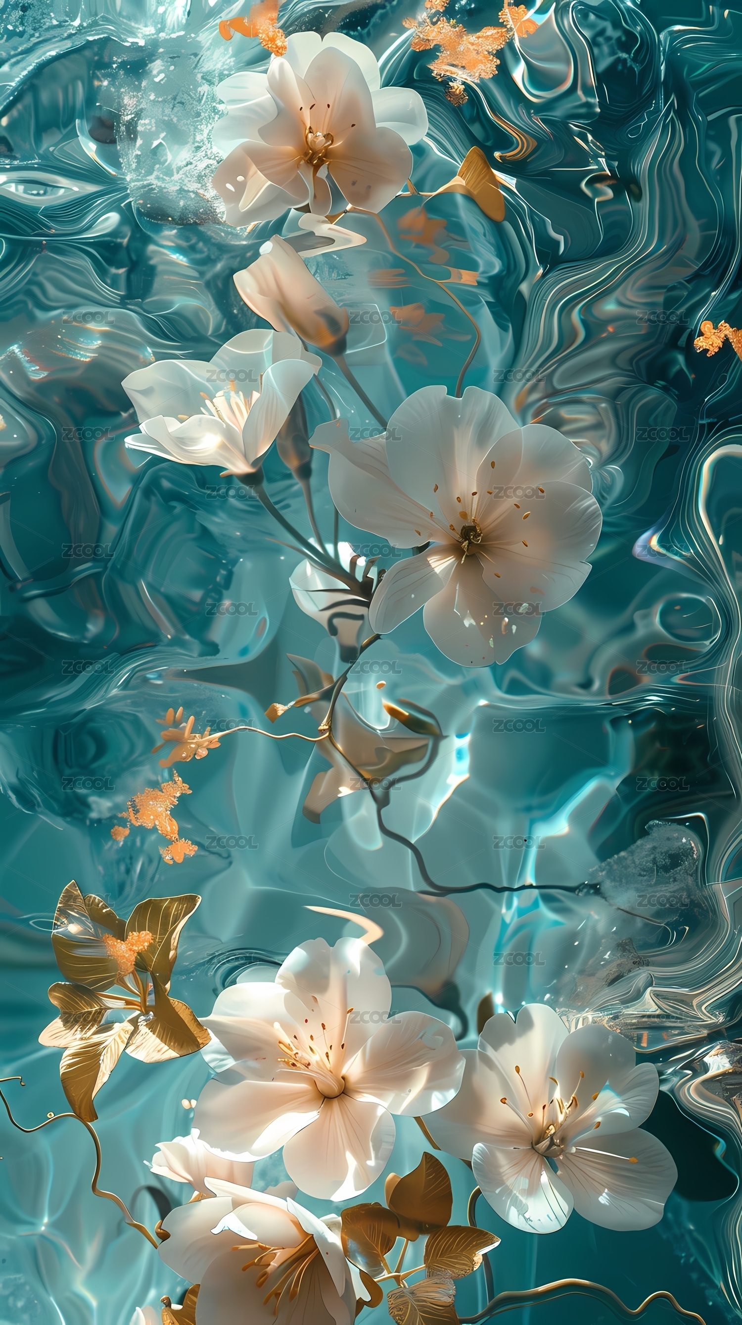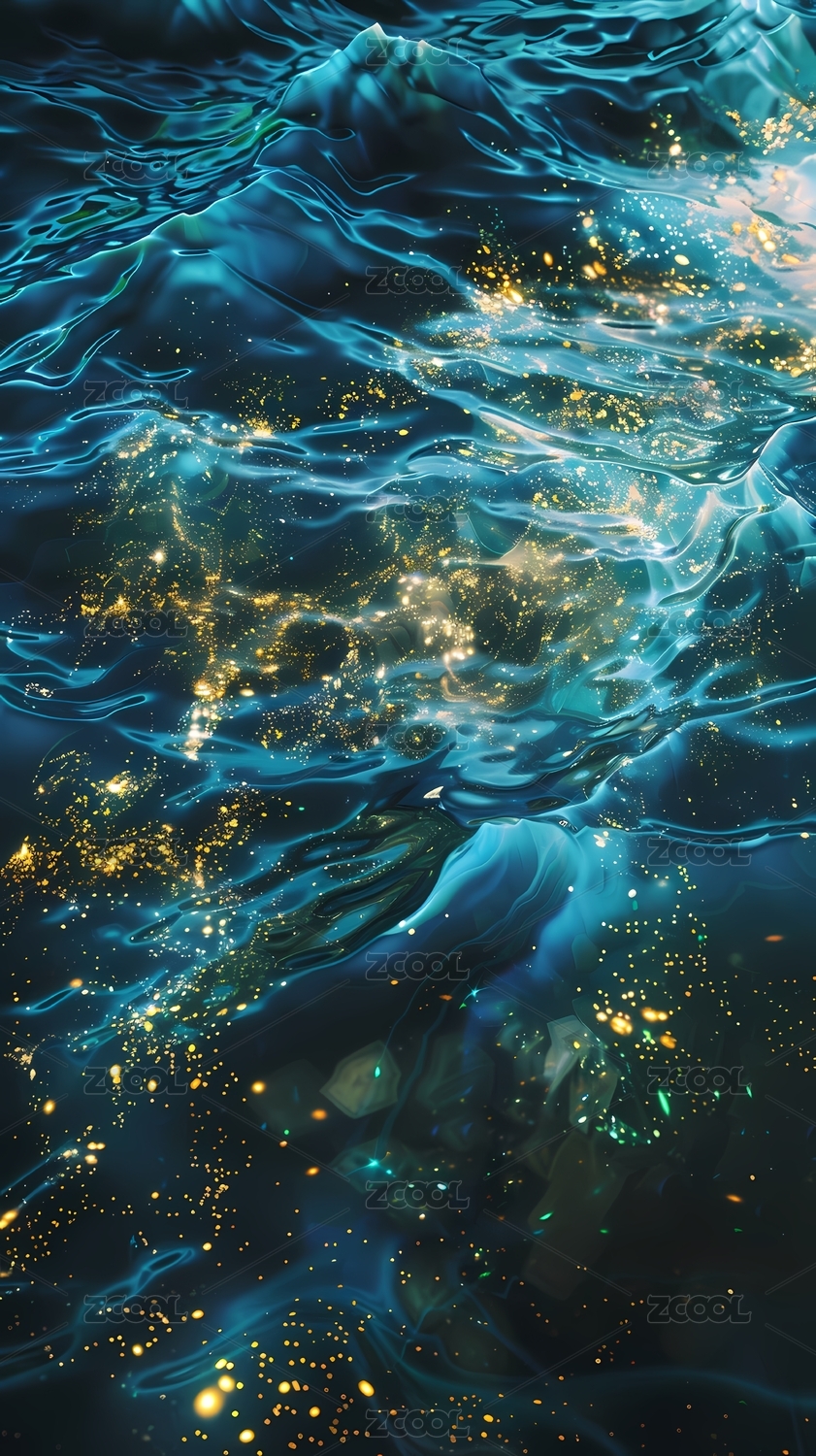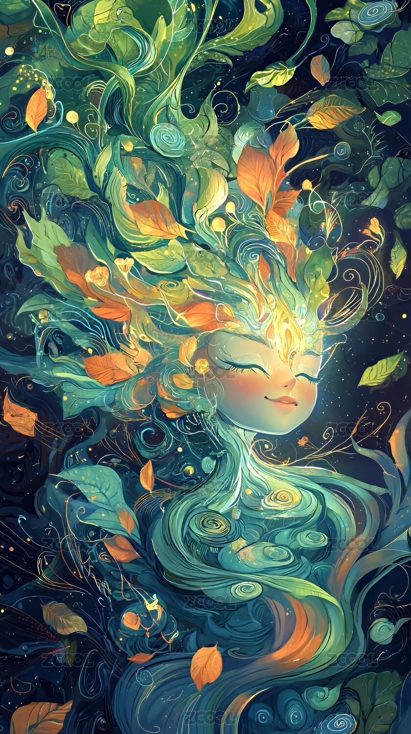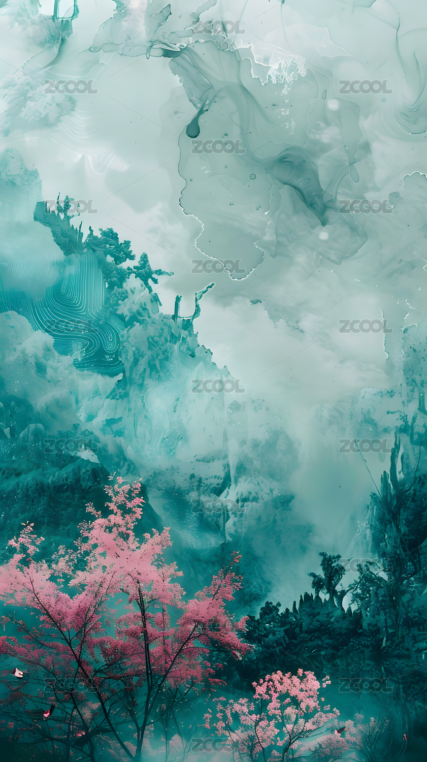 国风金色绿色从山崖飞落的瀑布插画绘画水墨
