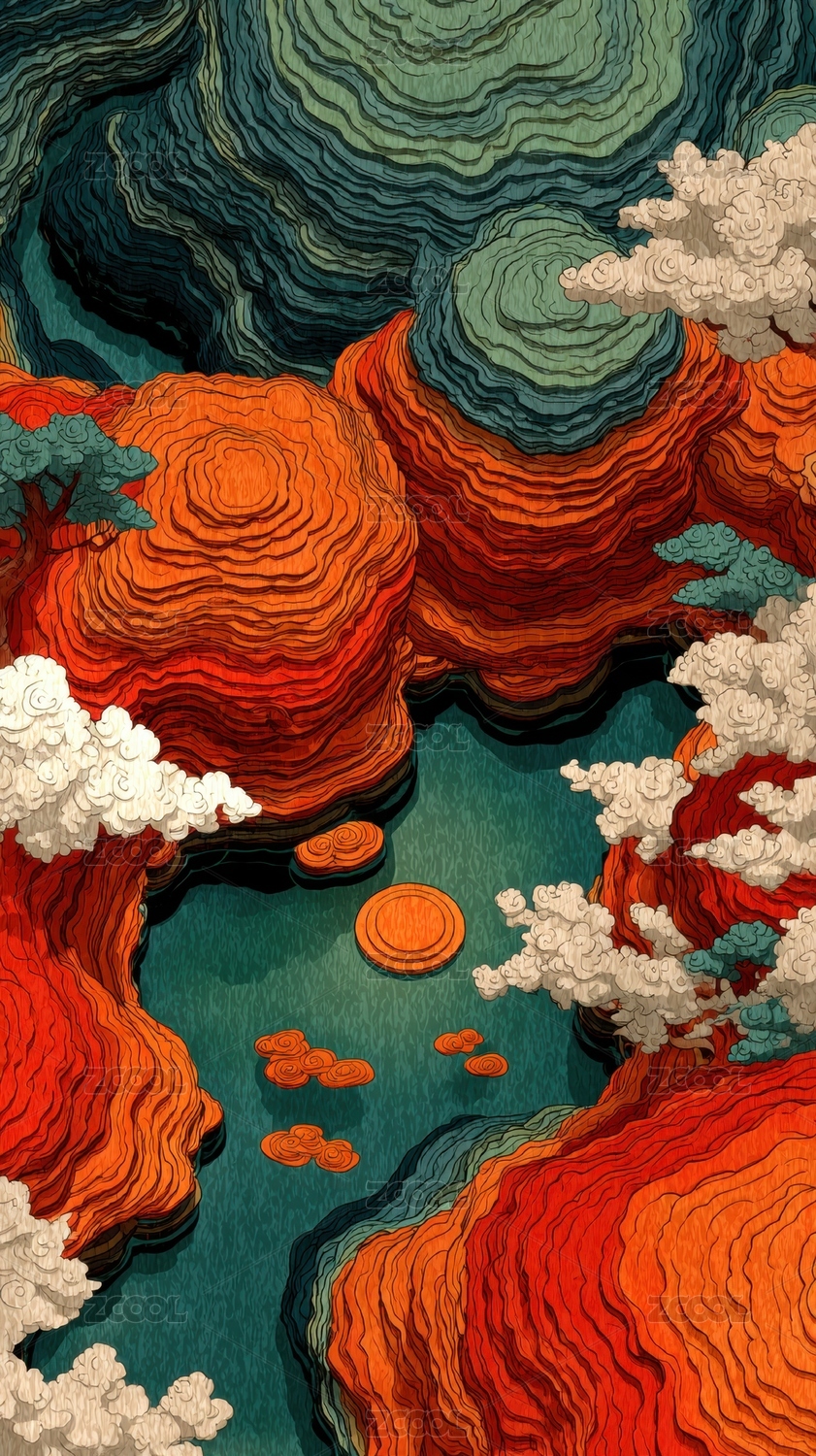 中国,禅,花园,传统,假山,湖,绘画,插图,海报,几何