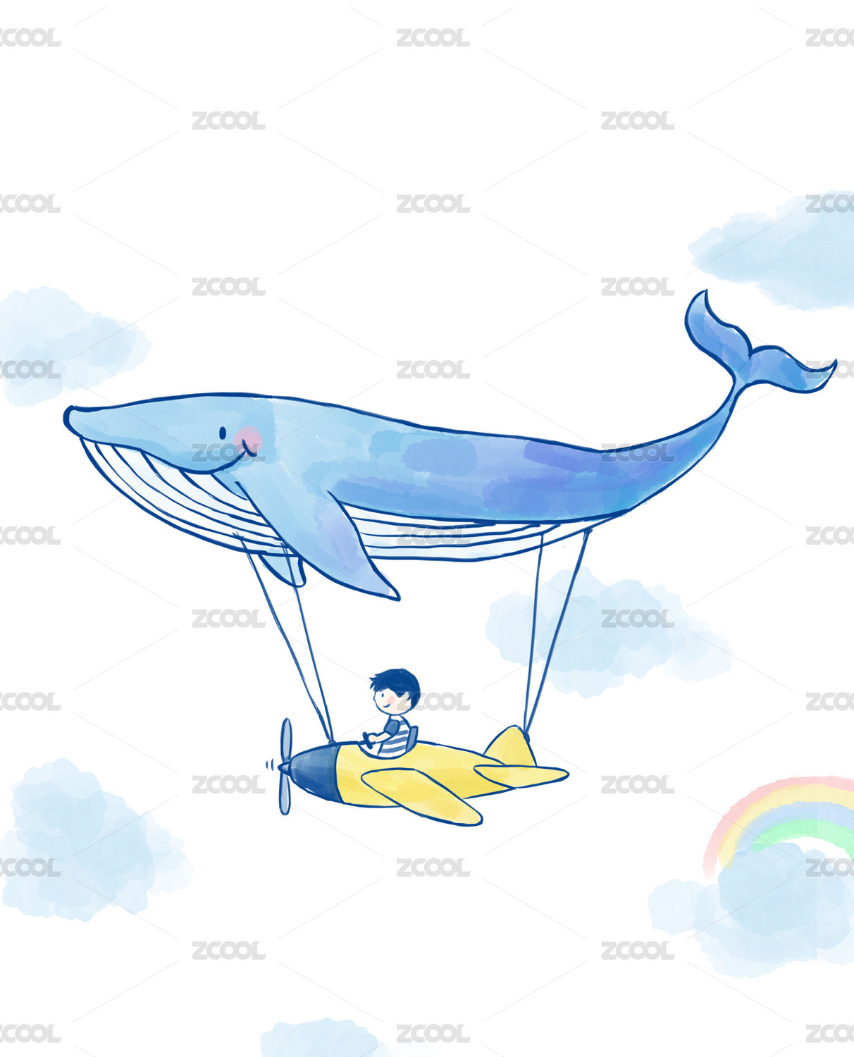 一只在天上飞的鲸鱼和一个开飞机的男孩