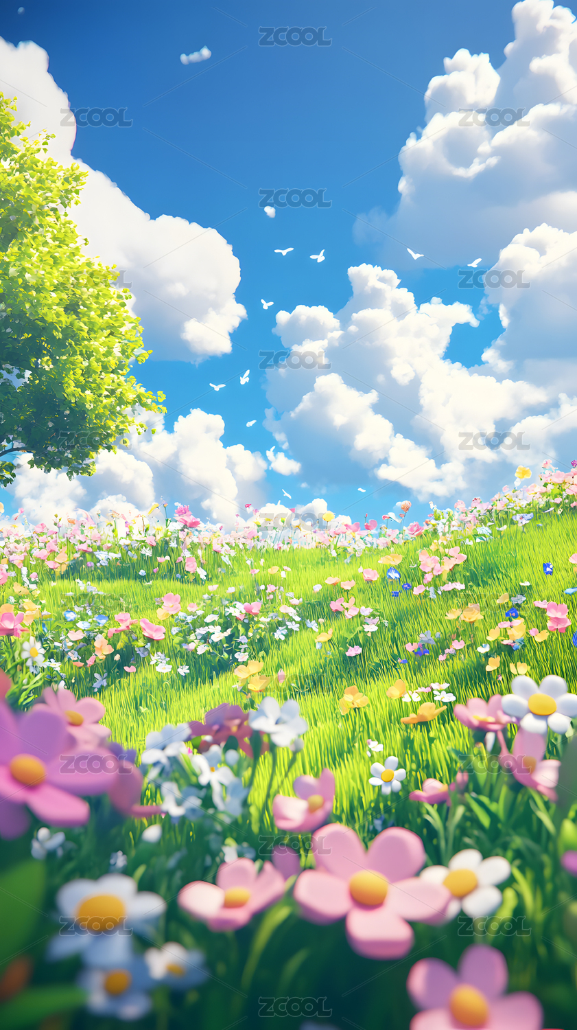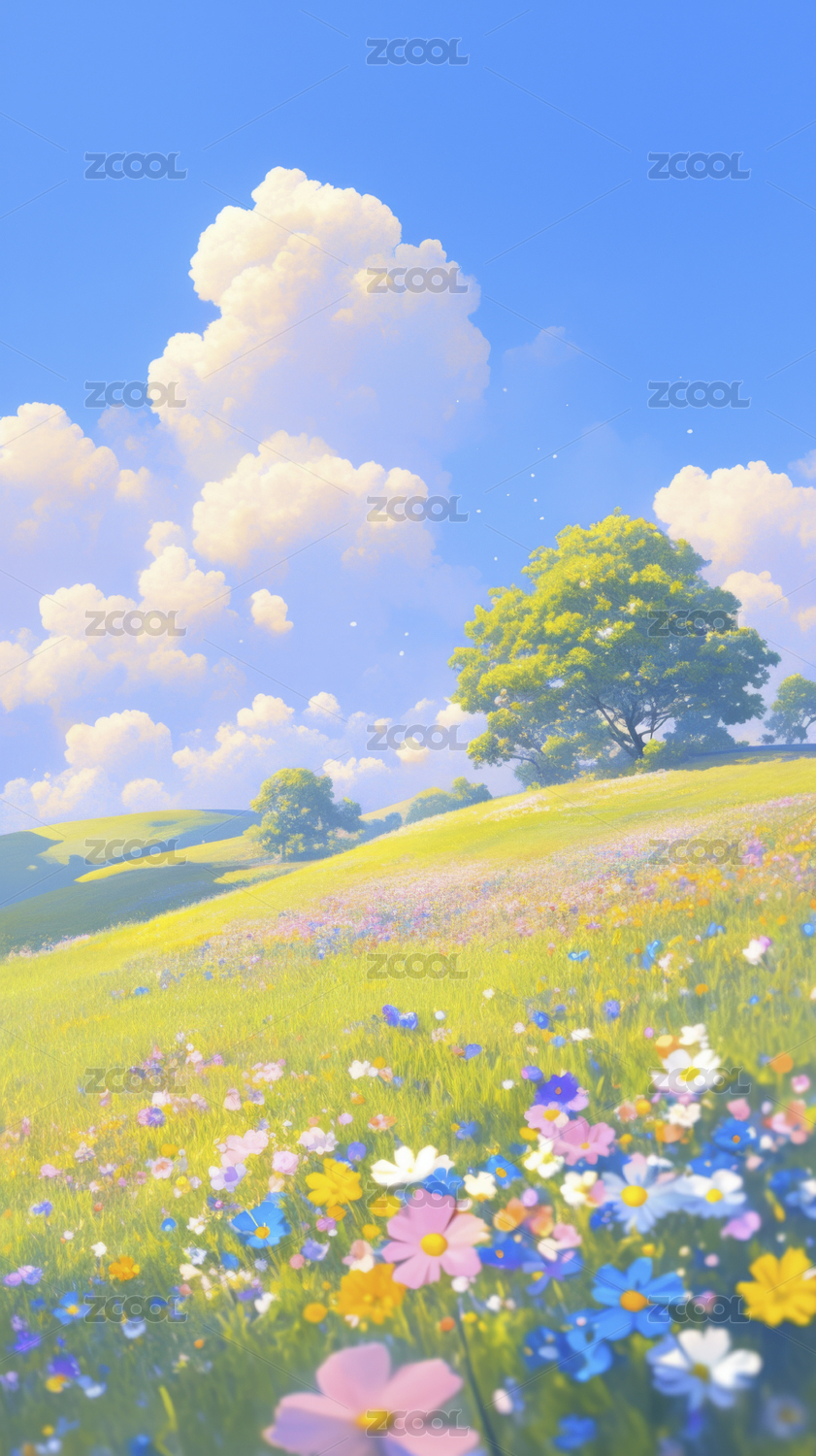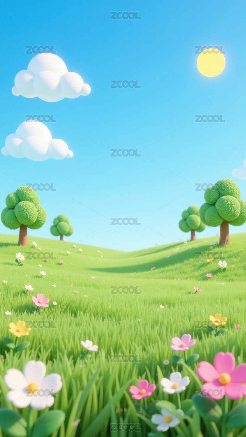 蓝天,白云,草地,花朵,树木,插画,清新,明媚,背景
