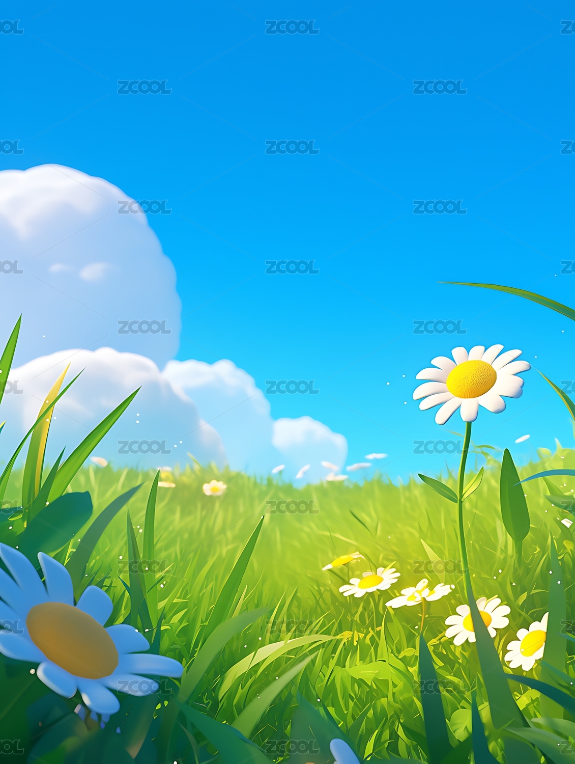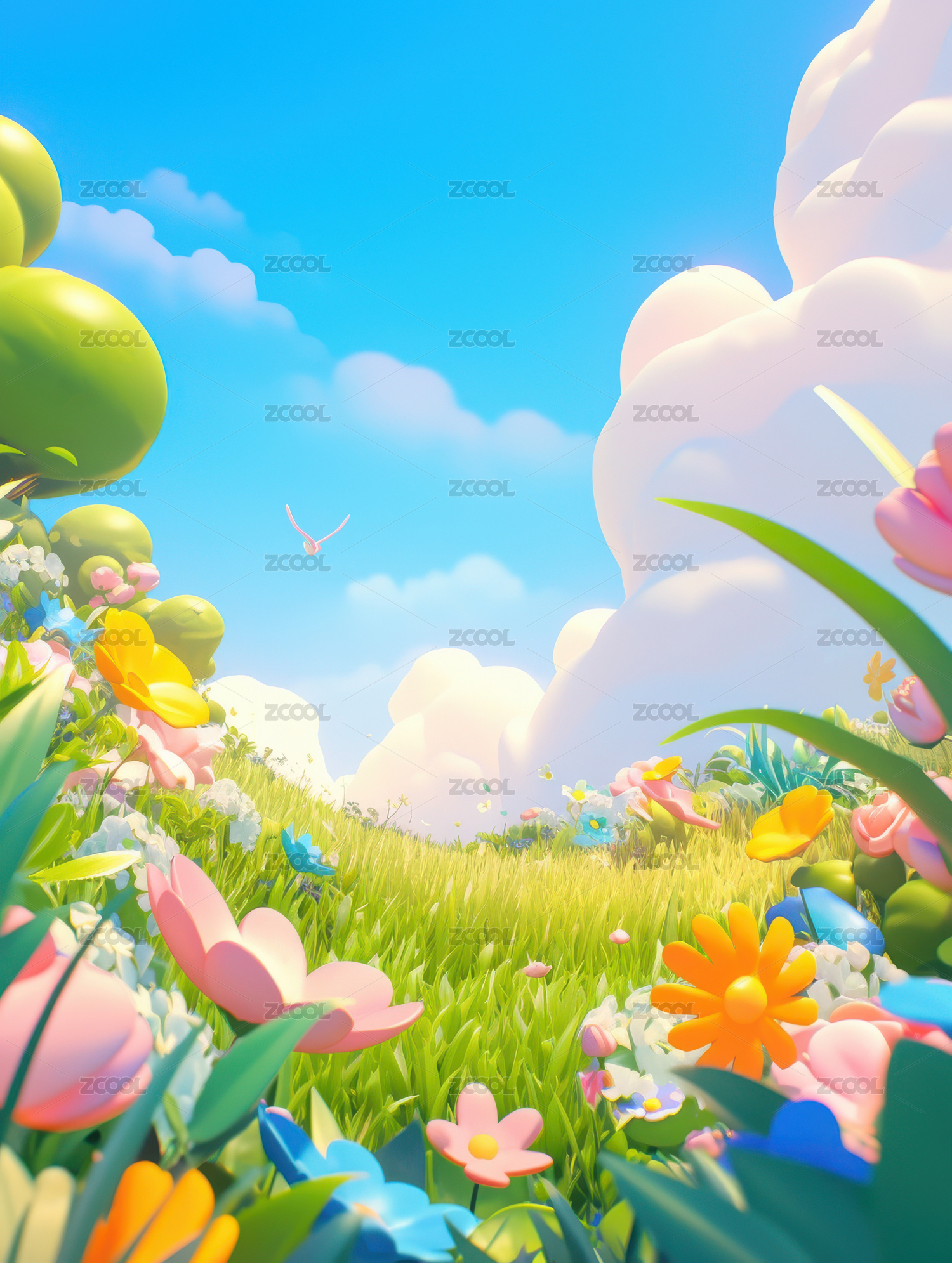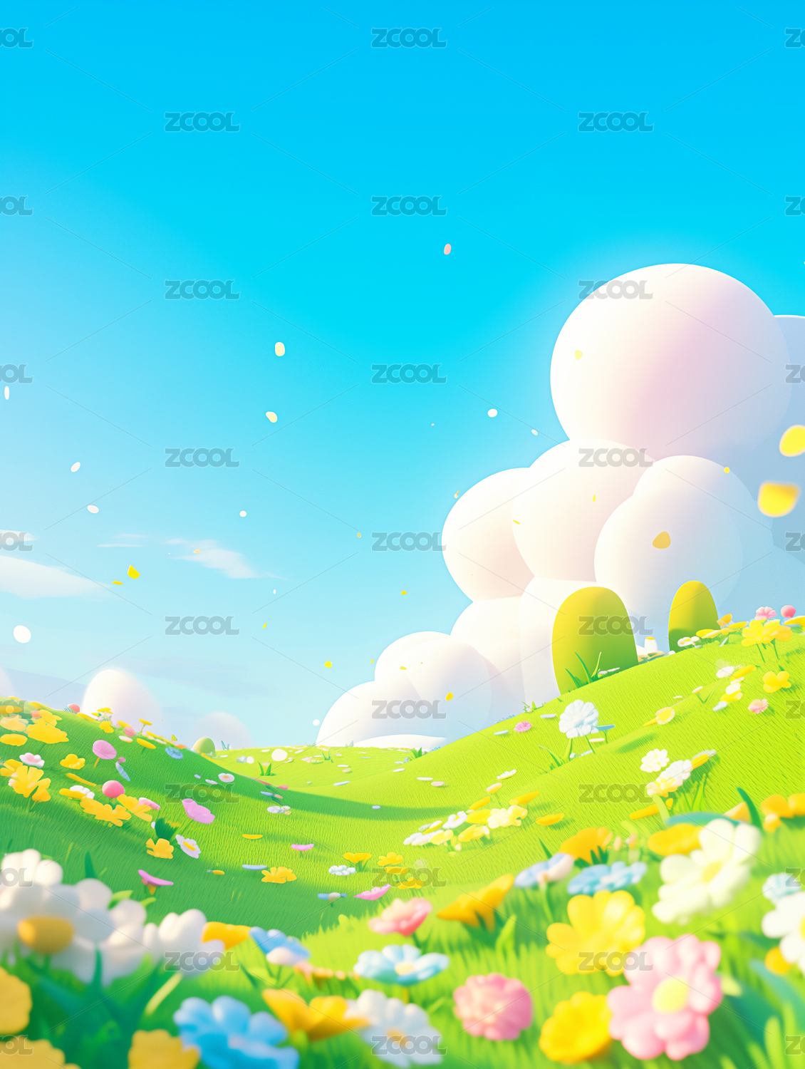 春天鲜花草地蓝天白云田园风光清新卡通背景