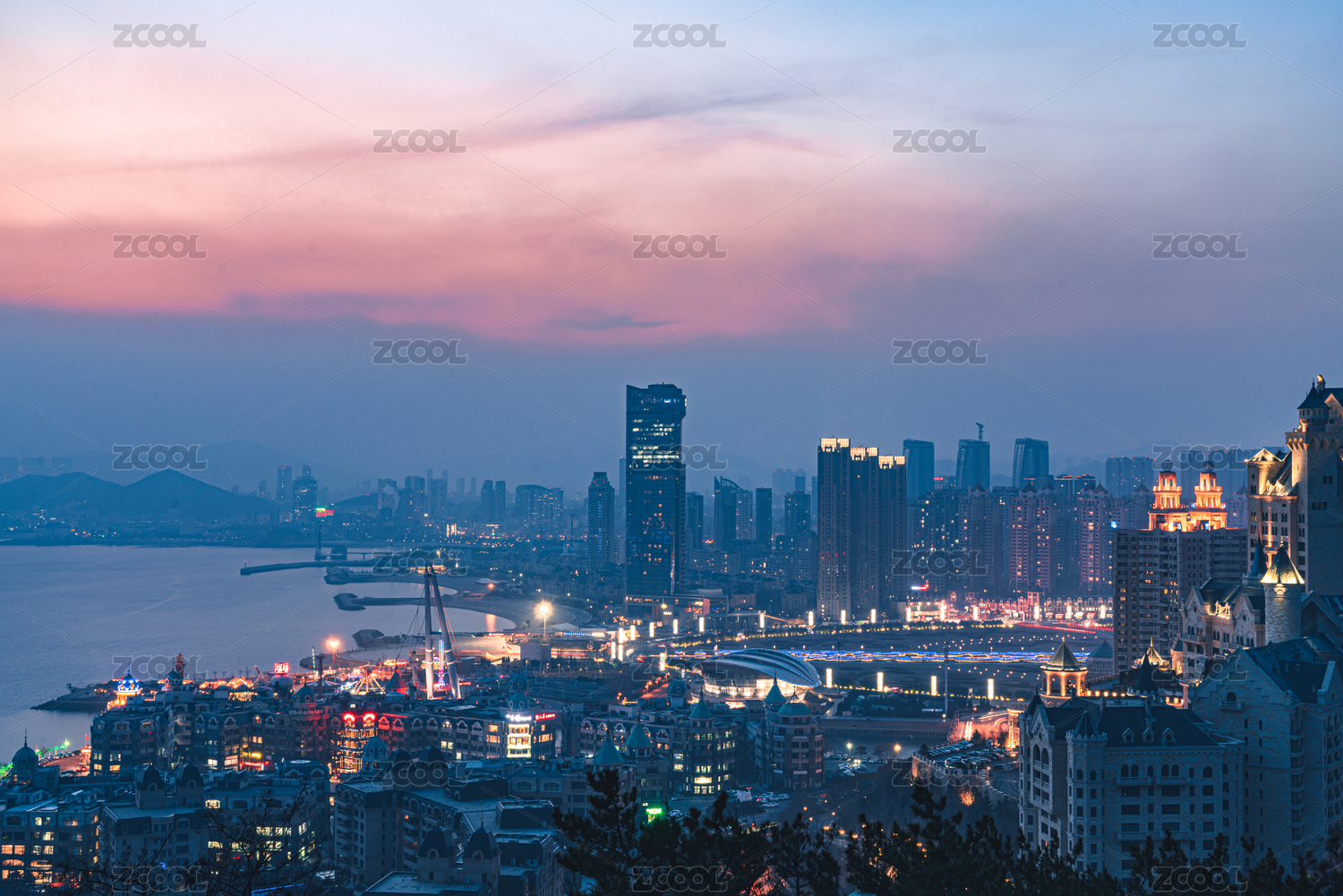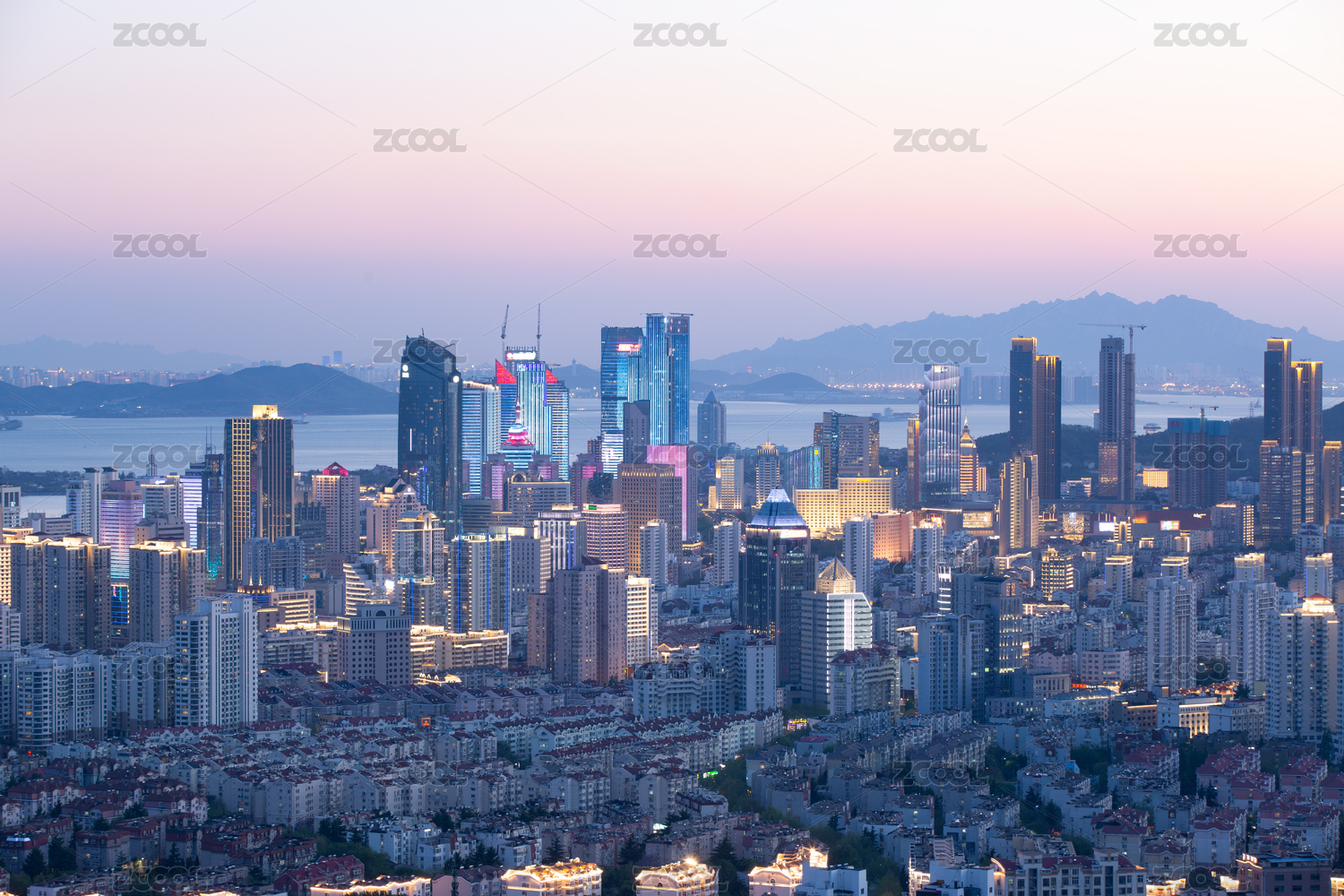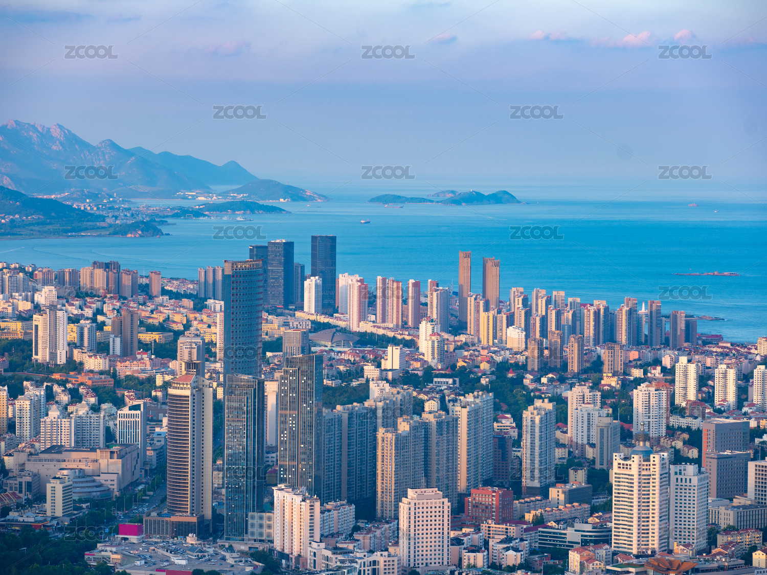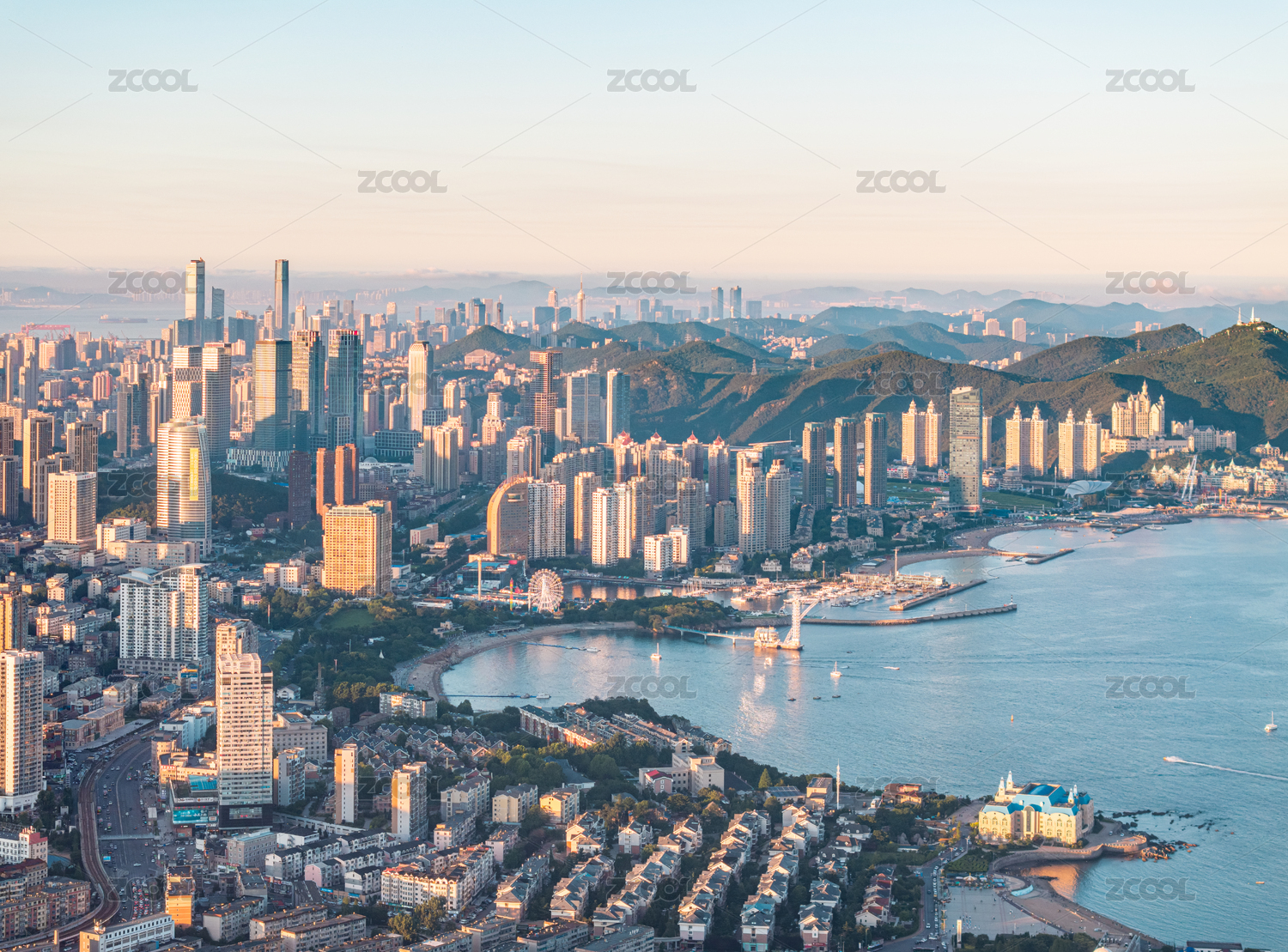 俯拍青岛现代建筑风光和夕阳日落自然景观