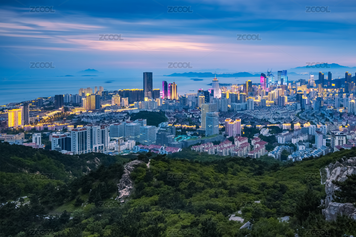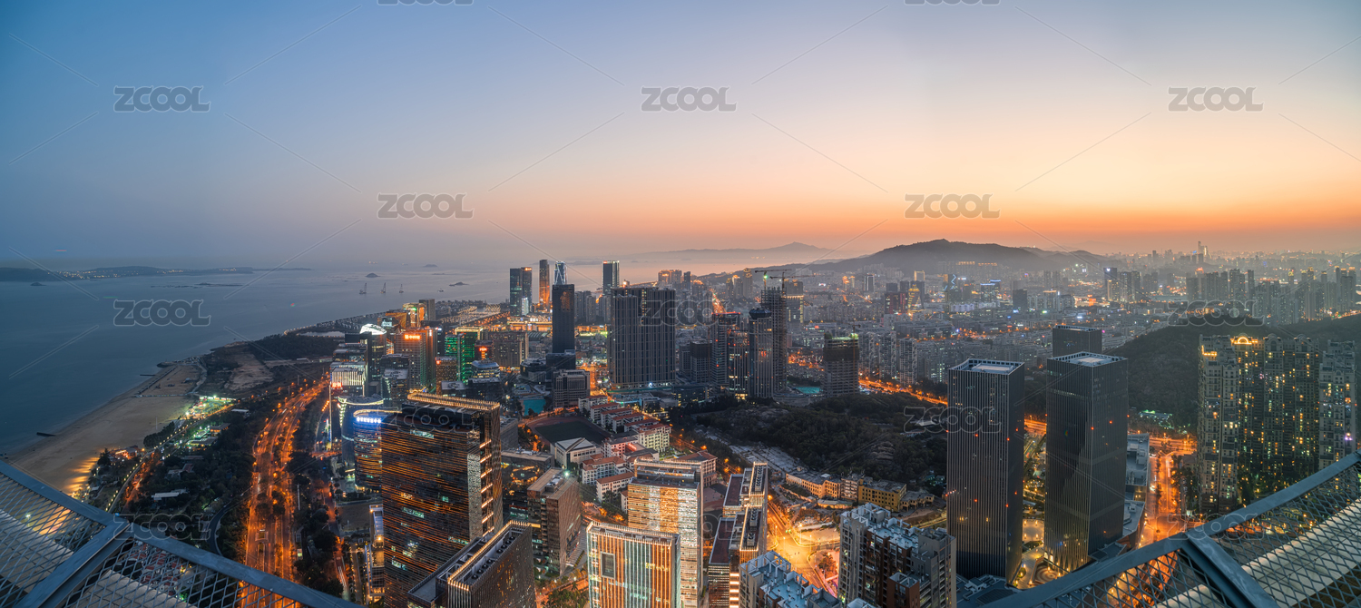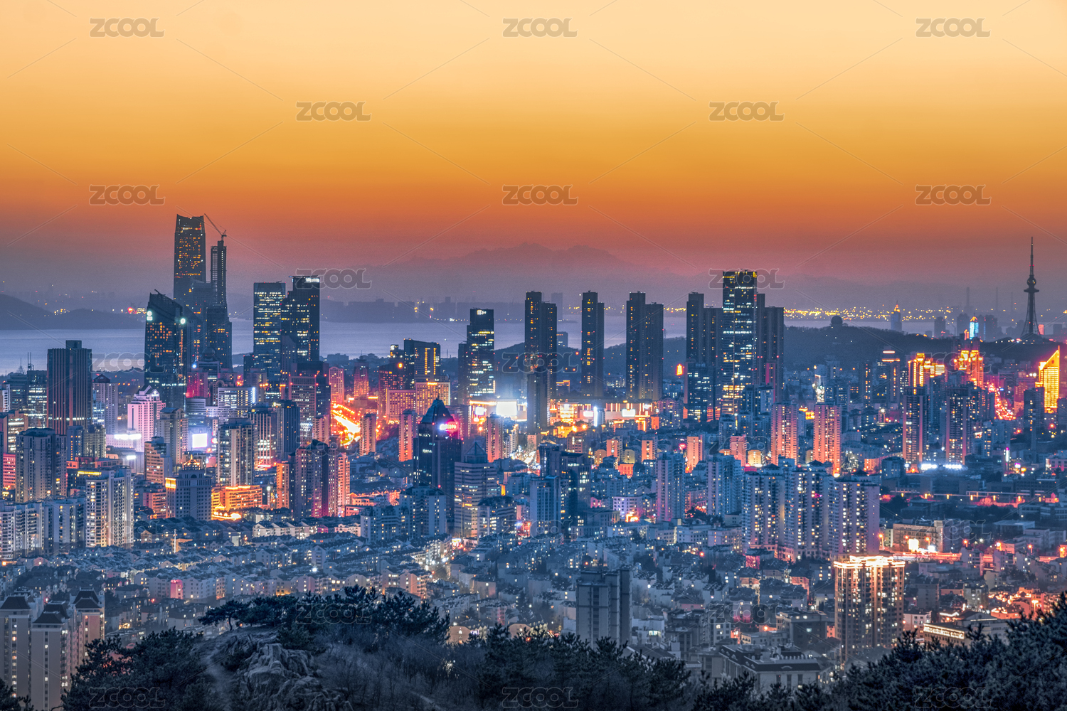 俯拍青岛现代建筑风光和夕阳日落自然景观