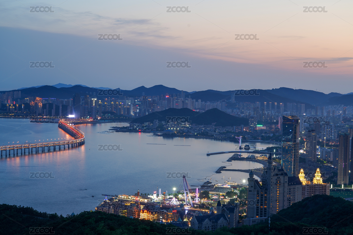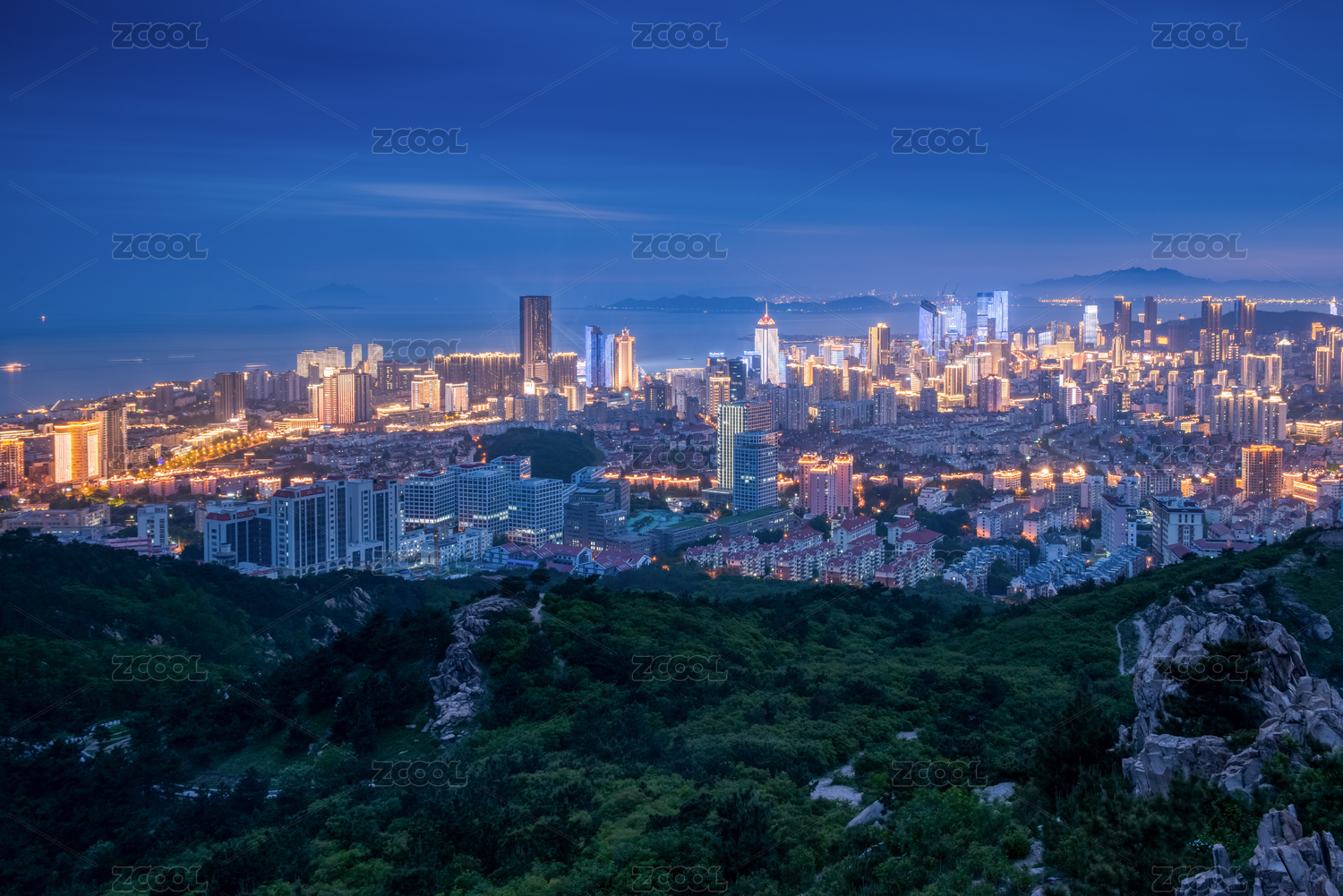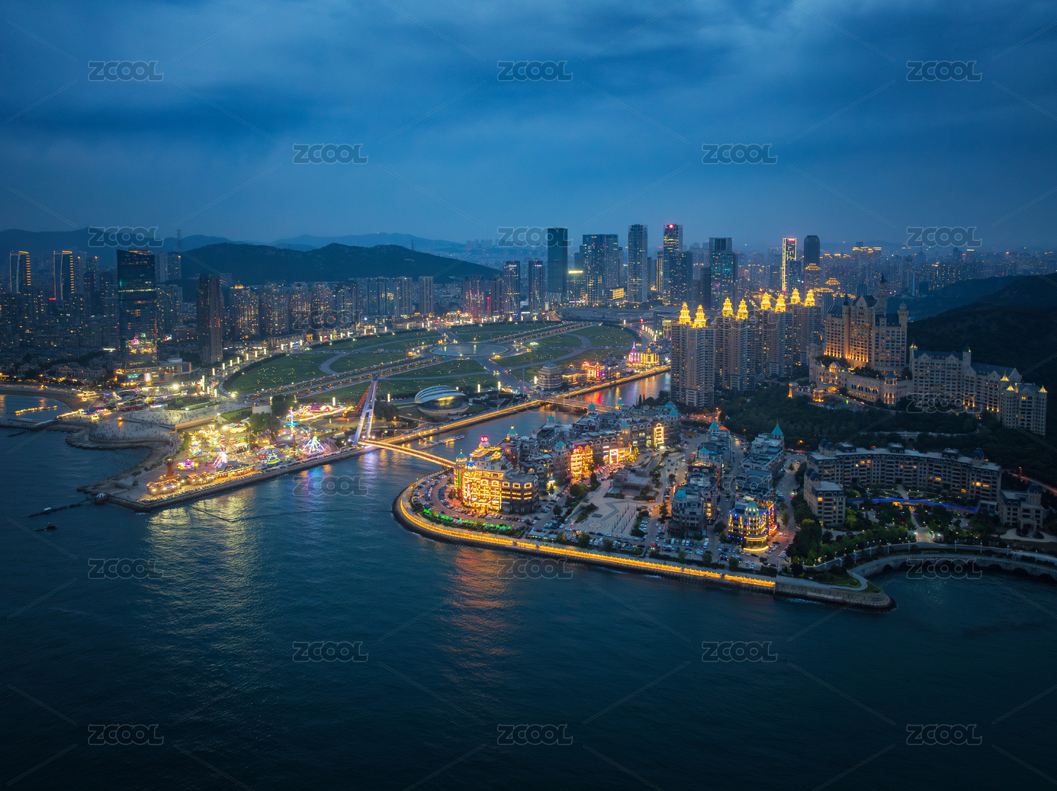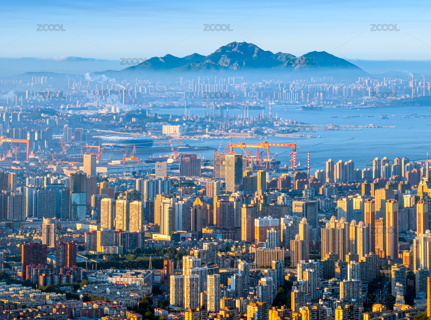俯拍青岛现代建筑风光和夕阳日落自然景观