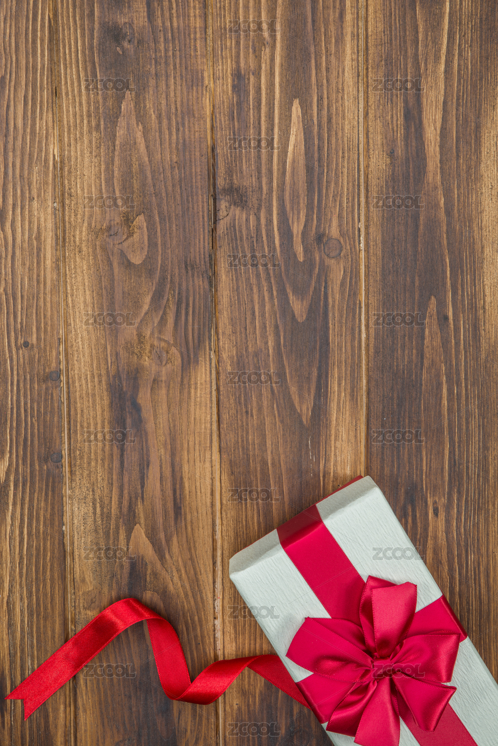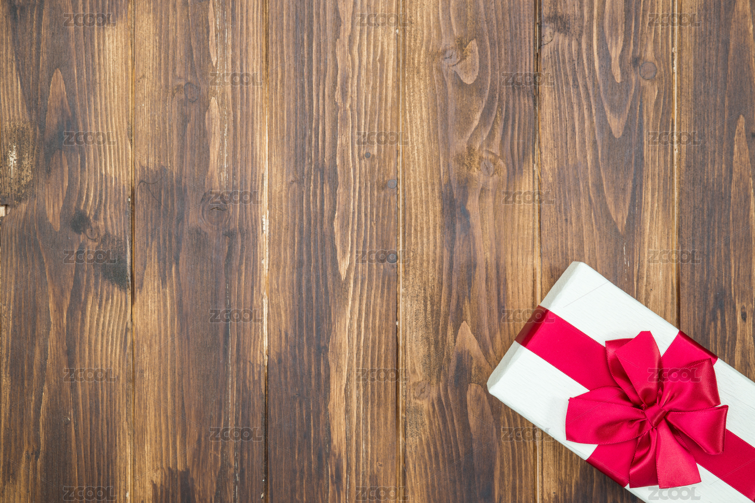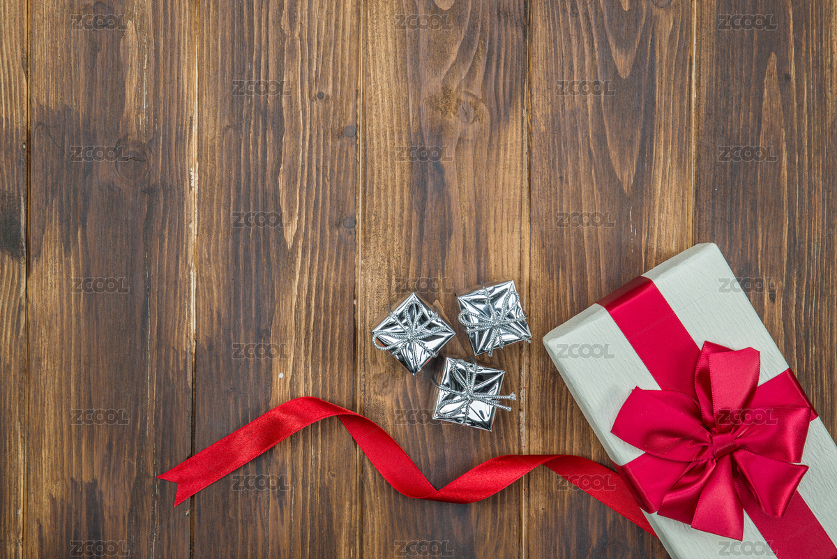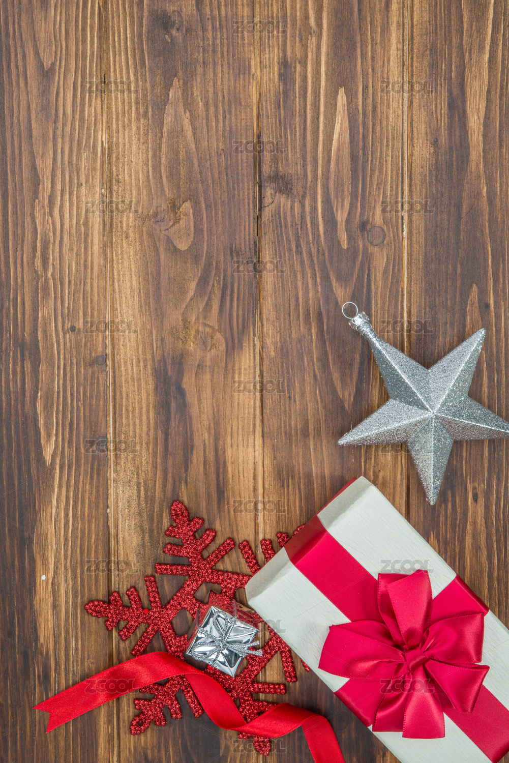 白色礼品红色丝绸包裹与雪花和星星形状的木制背景