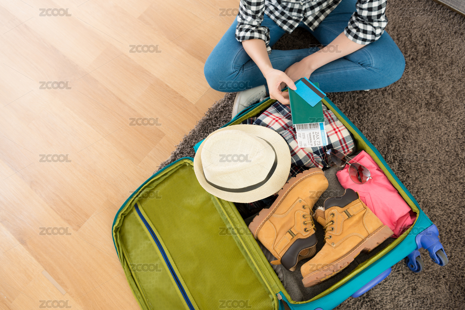 的年轻女子坐在客厅的地板包装行李出登机牌和护照与信用卡俯拍照片。