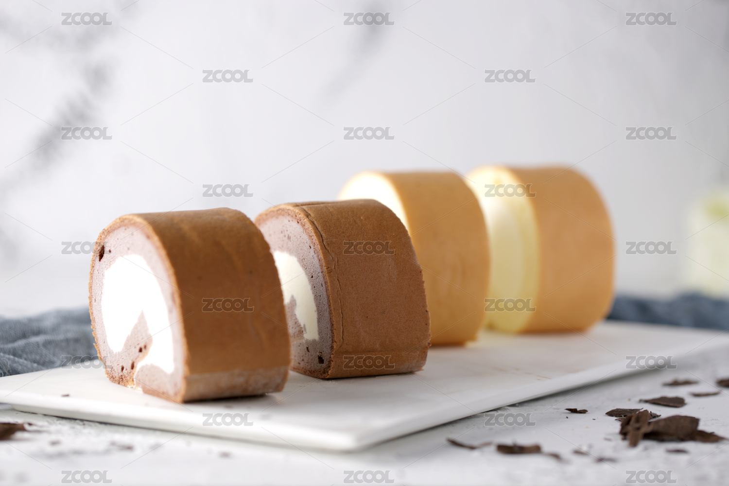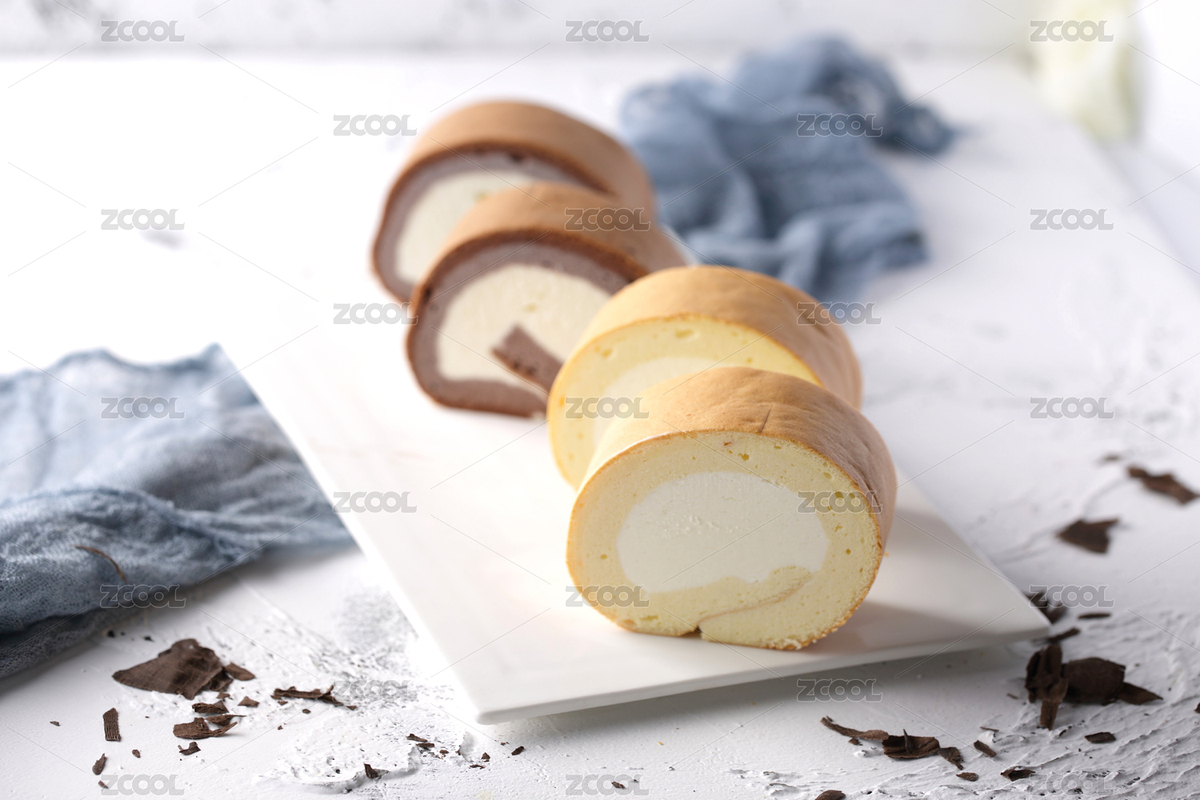 一盘鲜牛乳蛋糕卷摆放在桌面上特写