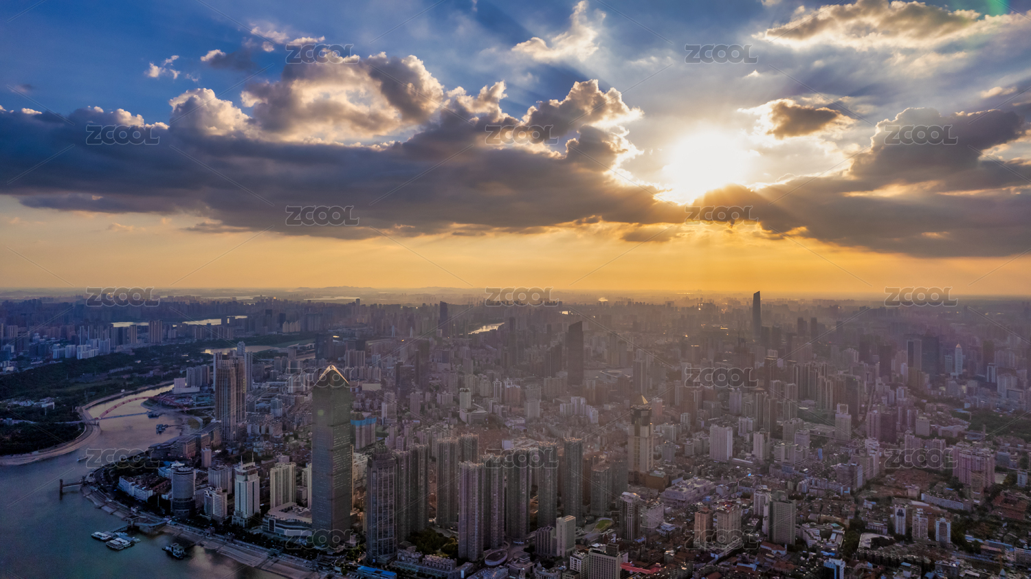 中国湖北武汉汉阳江滩傍晚城市航拍