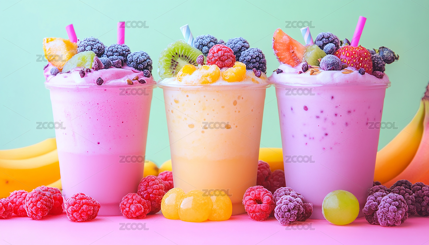 三杯不同口味冷饮水果饮料草莓柠檬苹果