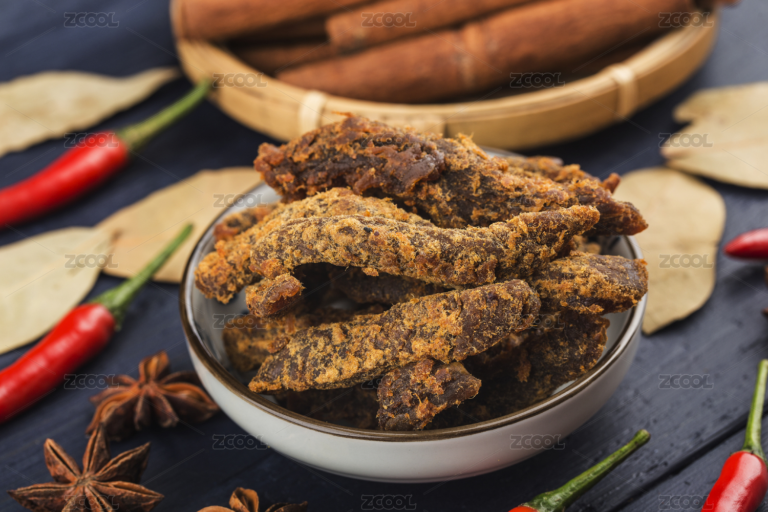 美味的香辣牛肉干摆放在桌面上