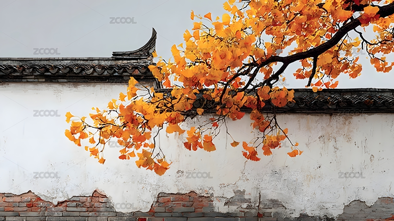 古墙秋叶银杏枝