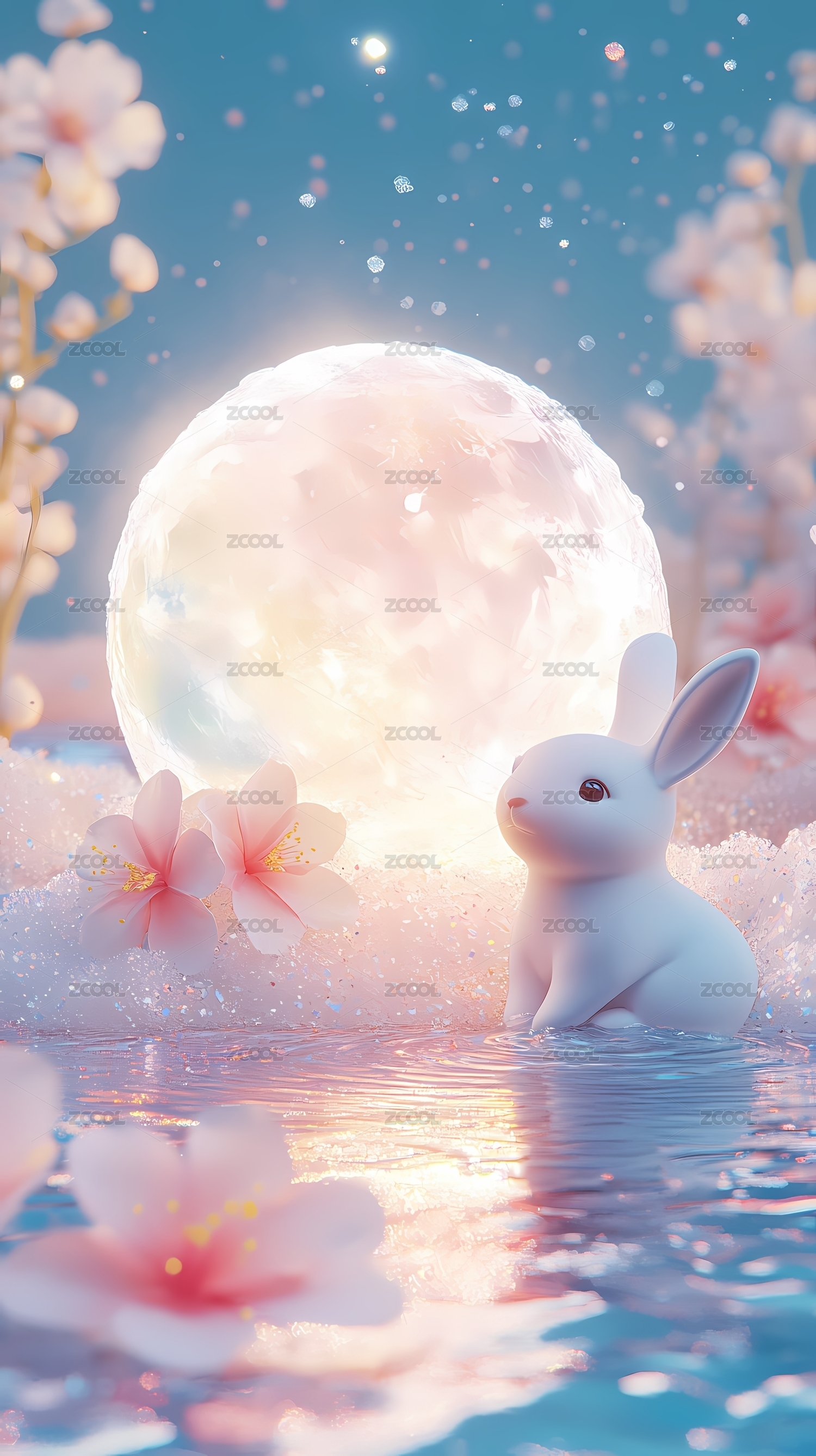 AIGC202403,中秋节,月兔,兔子,月亮,月光,圆月,满月,倒影,水面