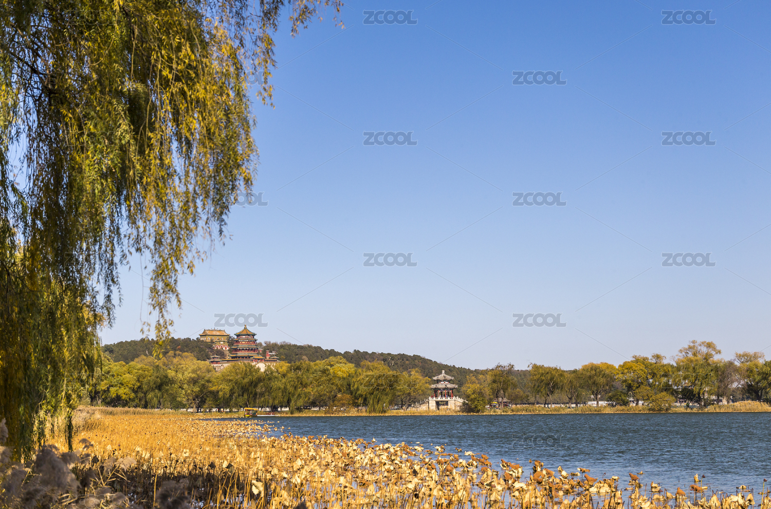 北京颐和园公园春季桃花湖水西堤传统古建筑
