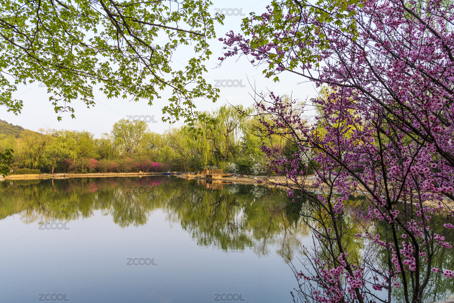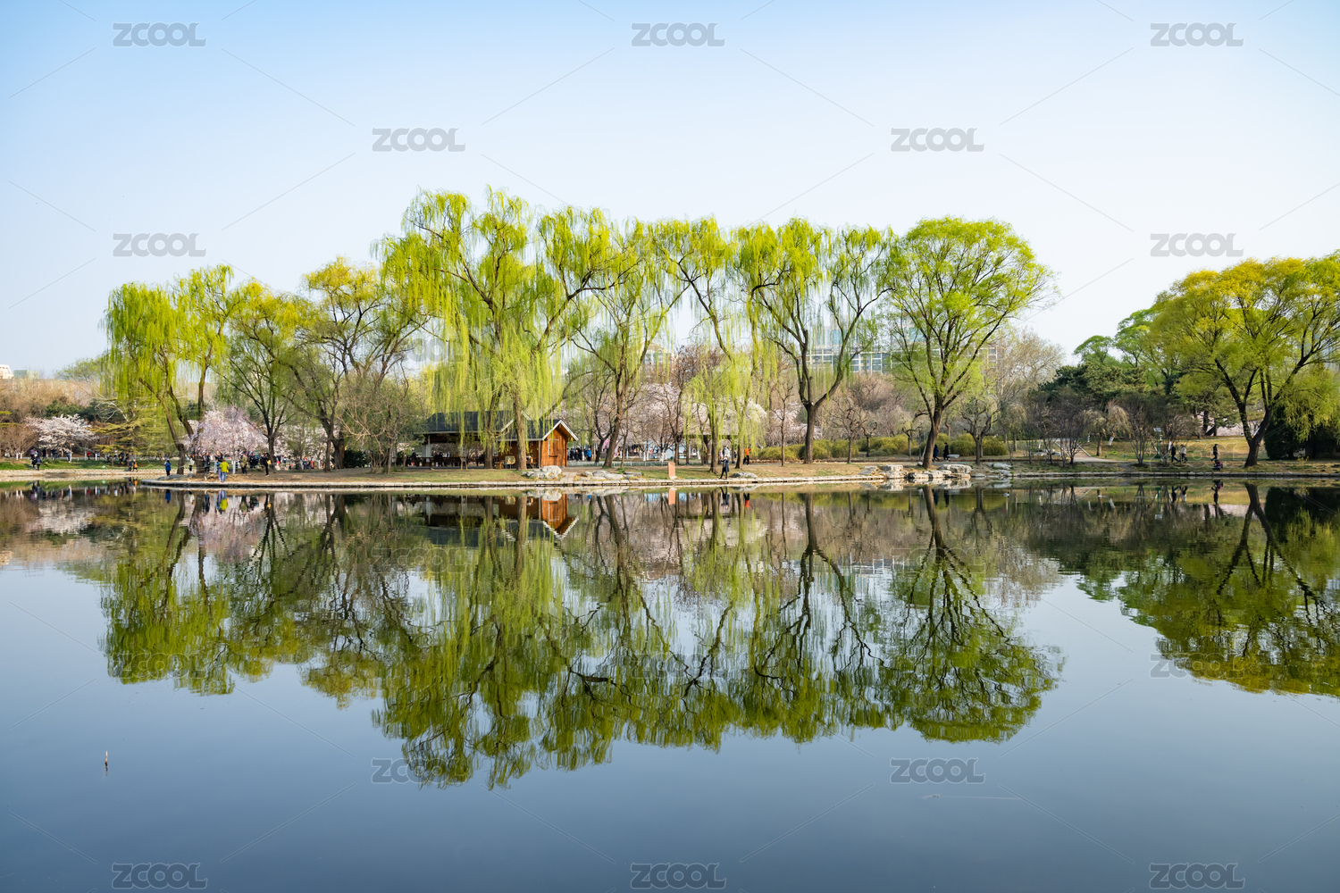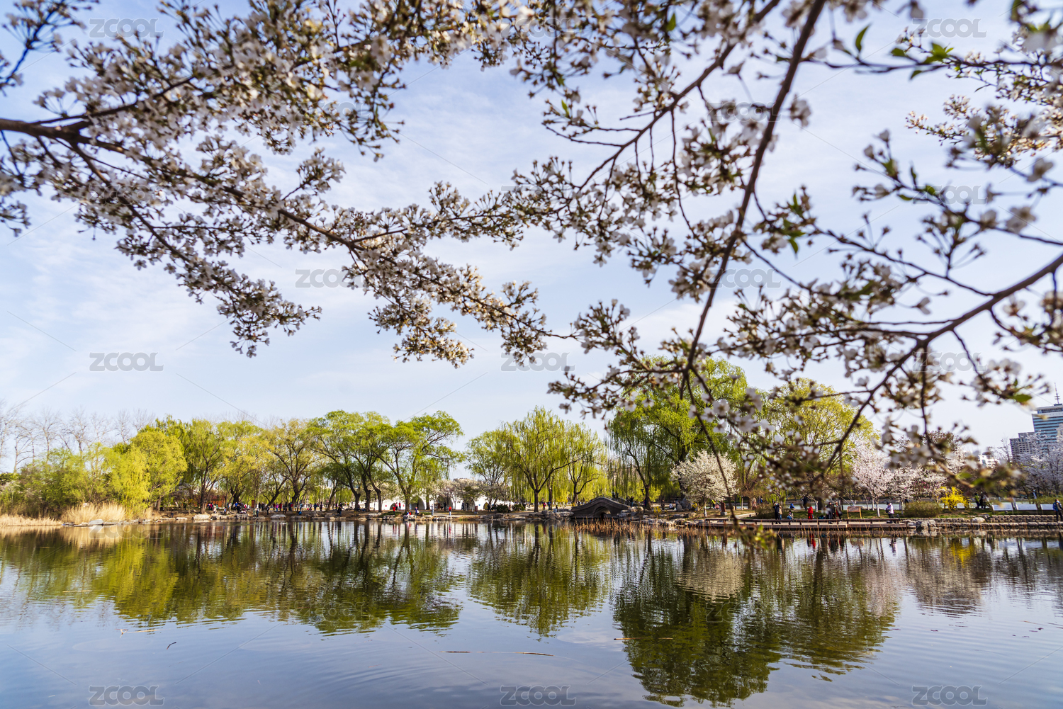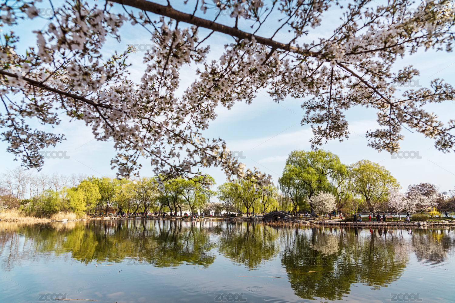 春日里中国北京市玉渊潭的樱花绿树和水中的倒影