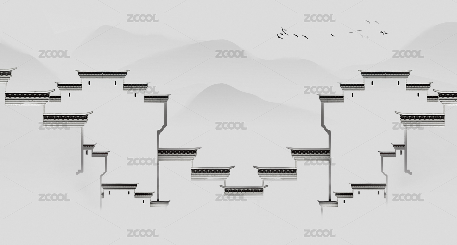 写意中国风淡雅意境水墨山水画 马头墙水墨画