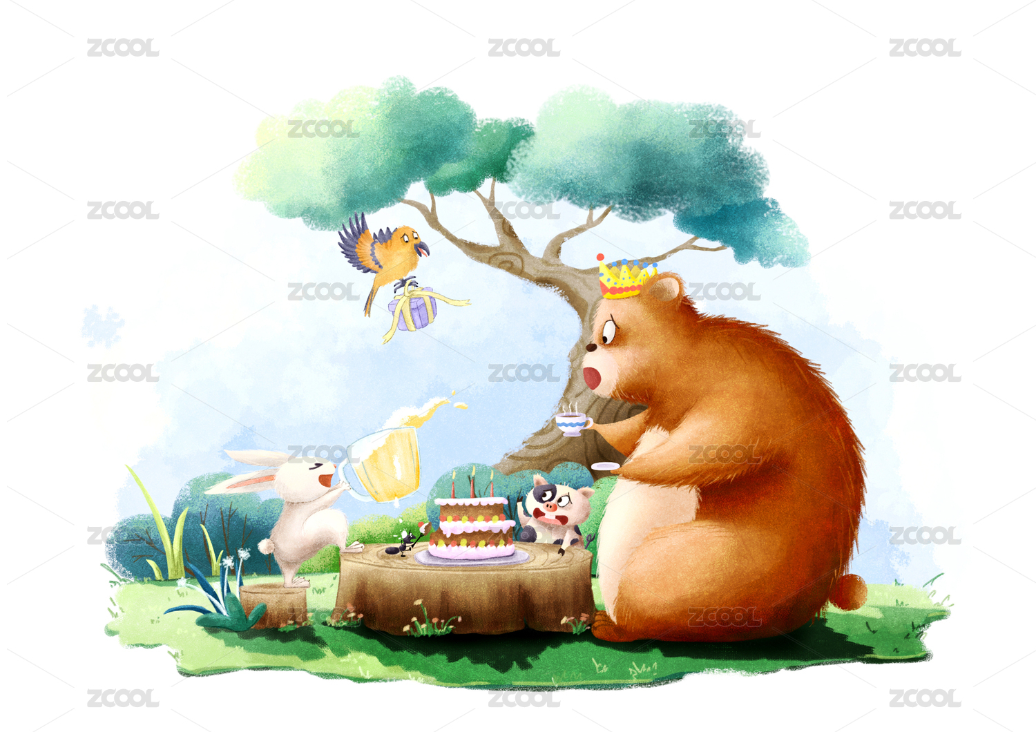 夏天草地上跳舞的小兔子、小松鼠和小熊