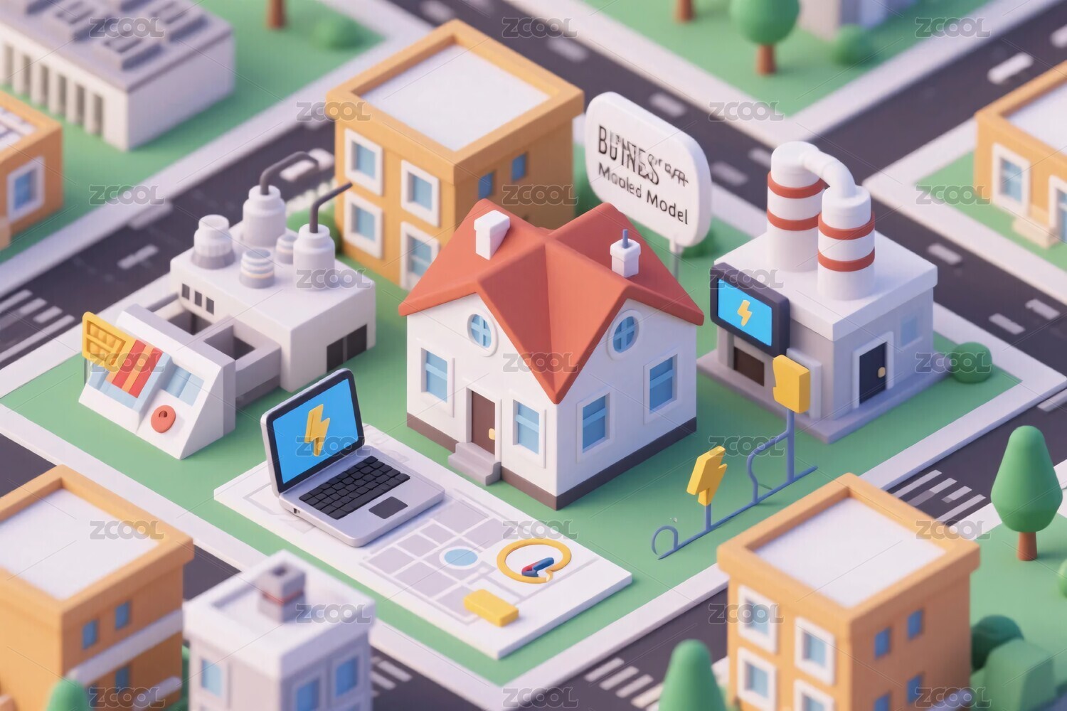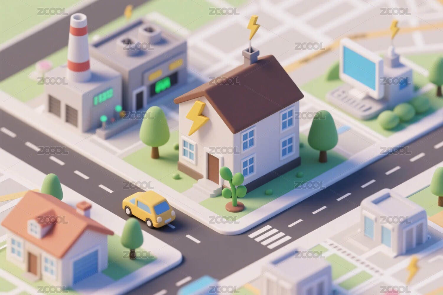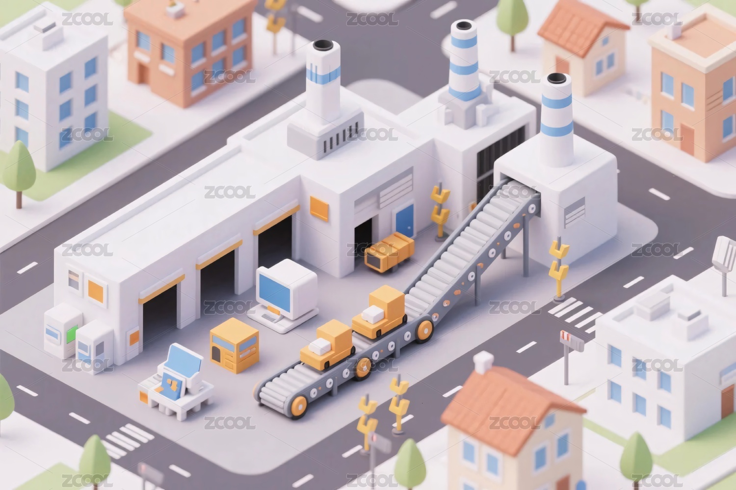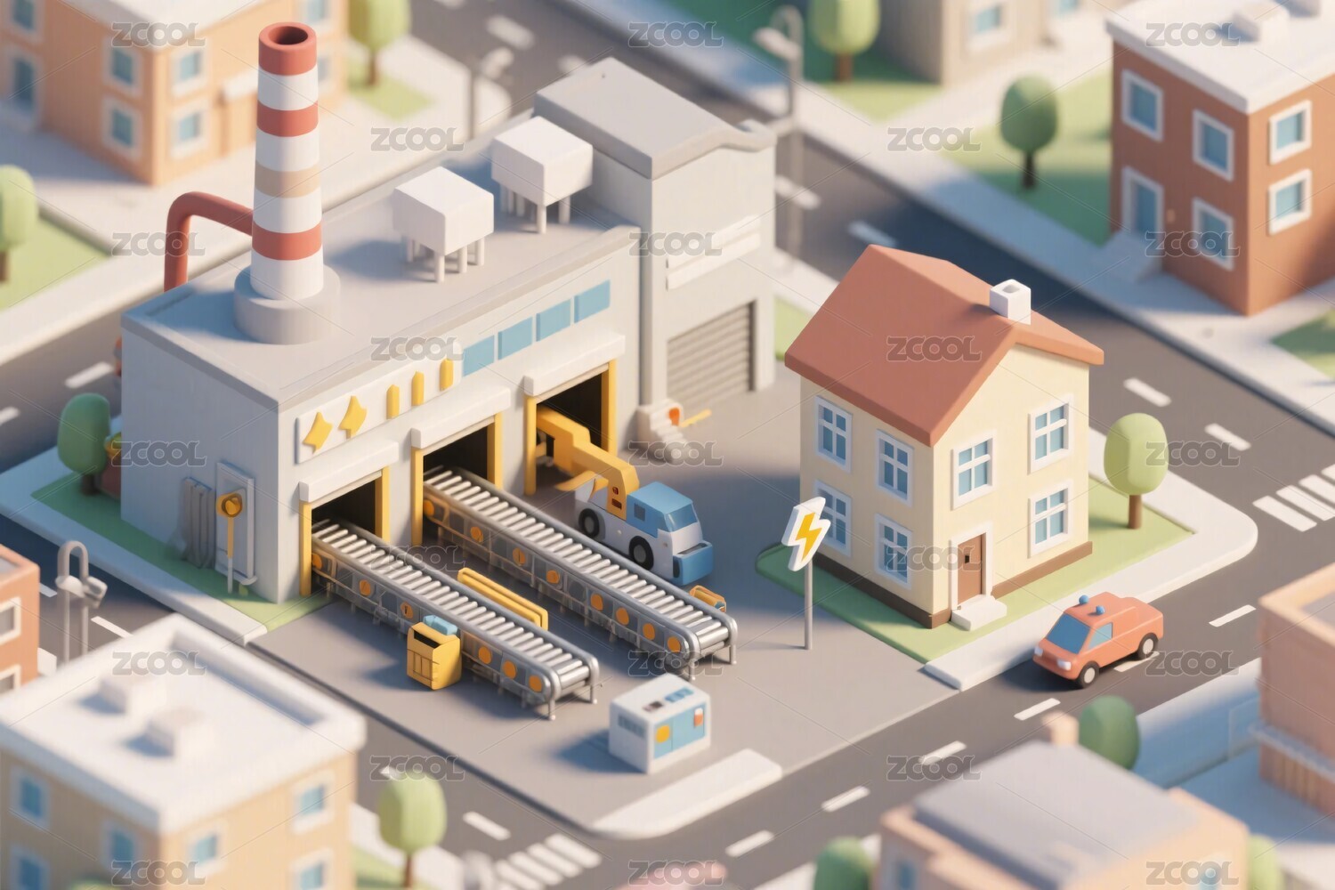 立体风格工厂与城镇场景