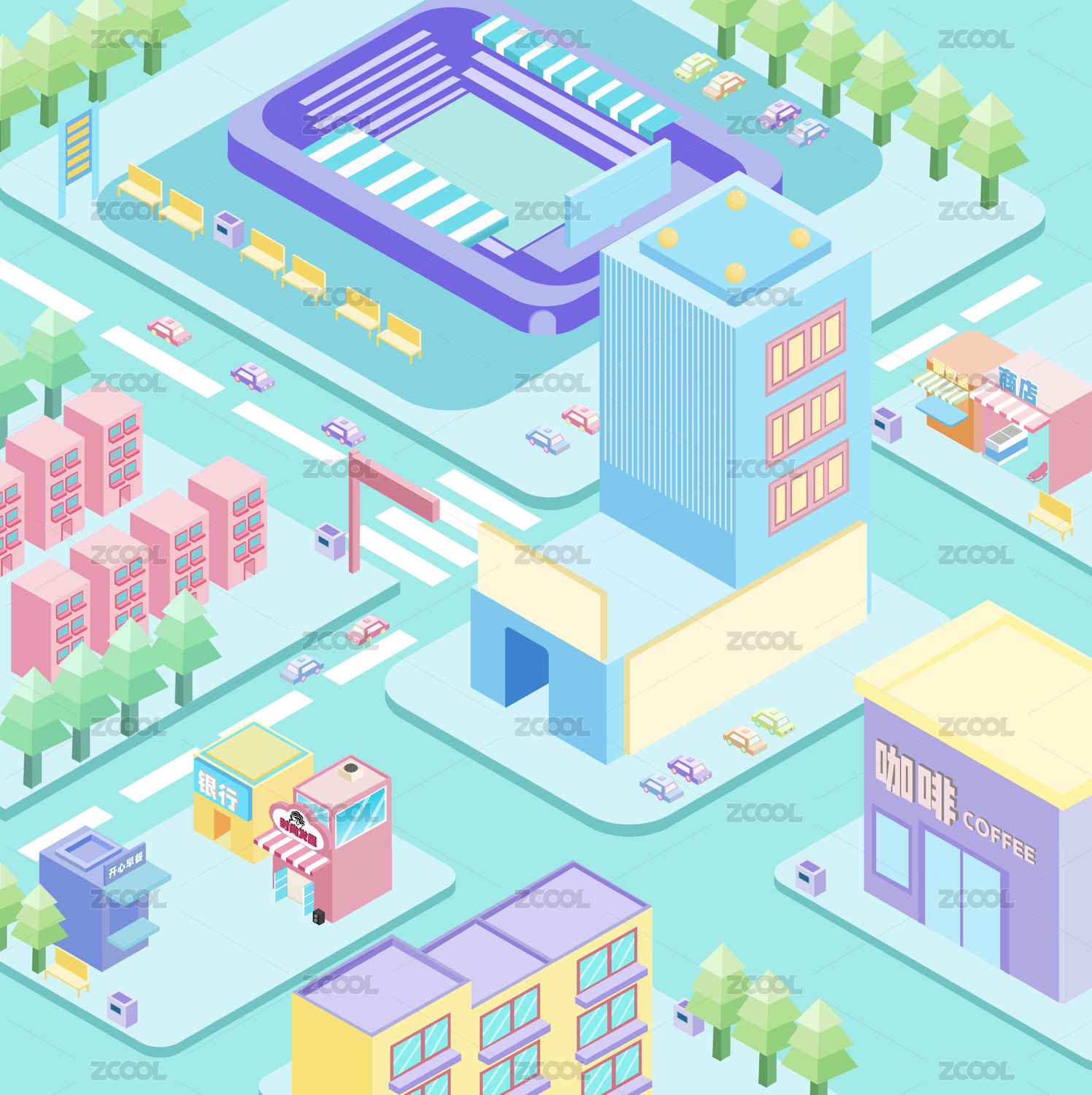 等距风格城市建筑插画
