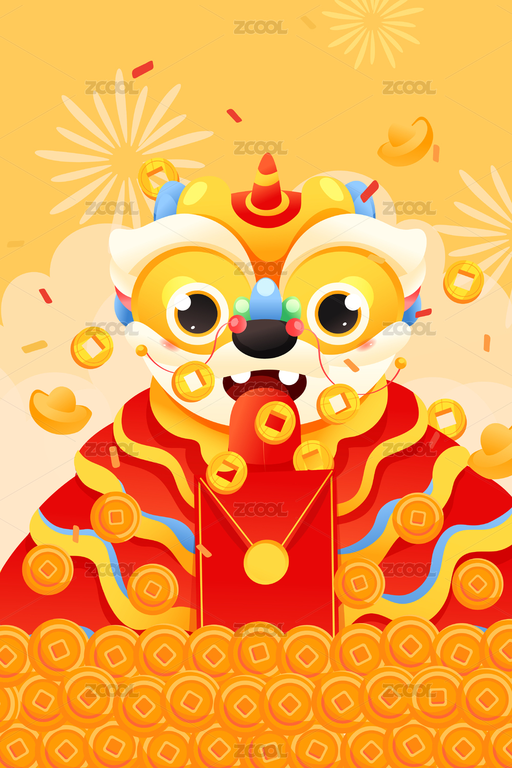 新春虎年舞狮祝福新年吉祥如意国潮矢量插画