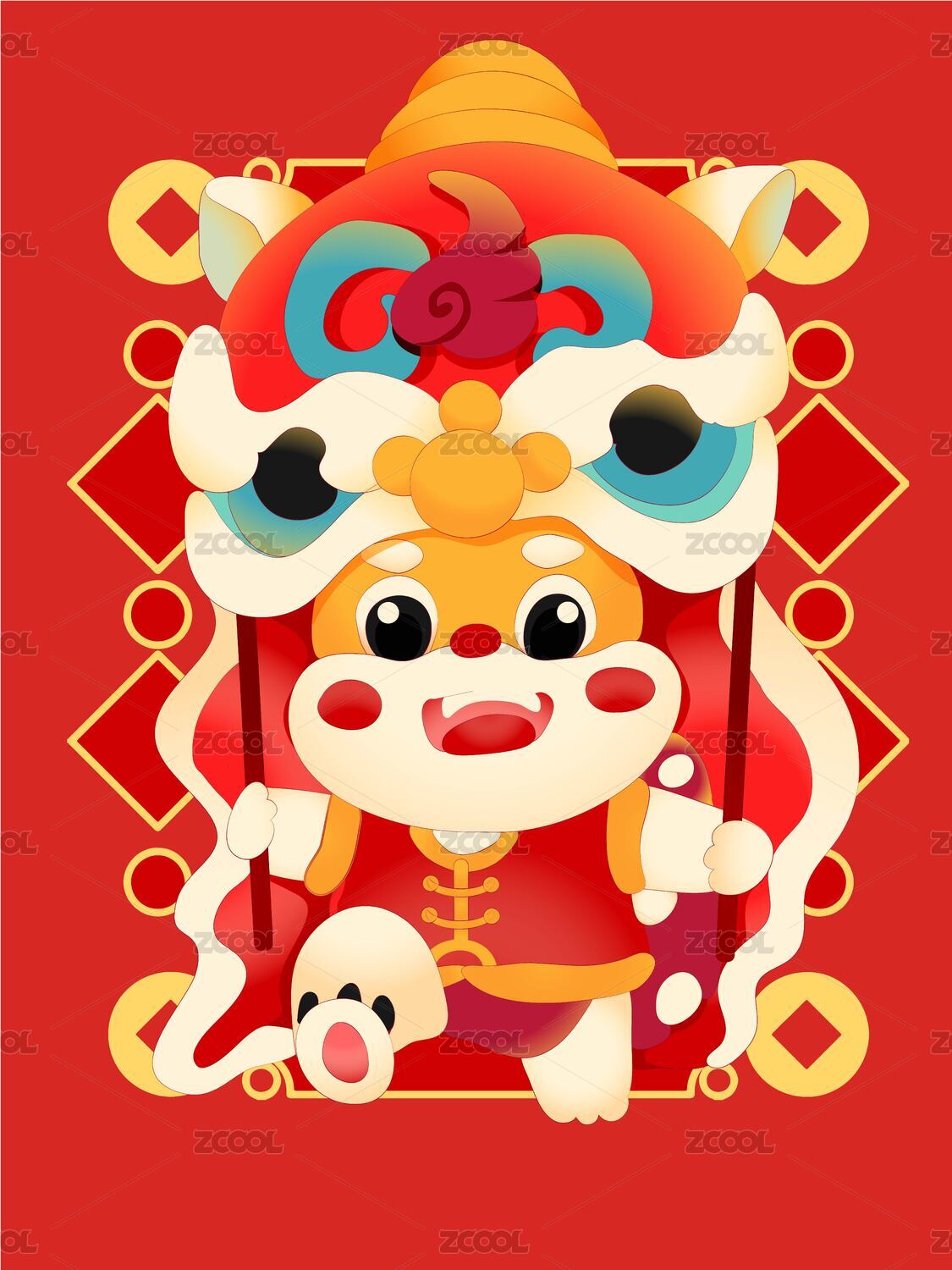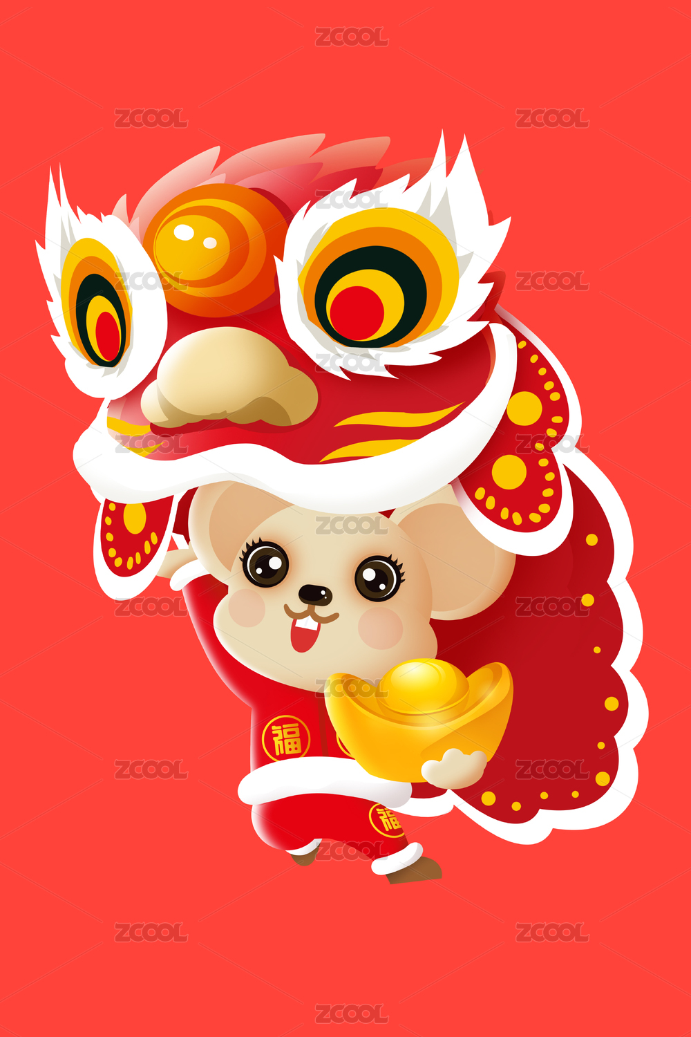卡通手绘新年红色喜庆老鼠舞狮红包闪屏插画