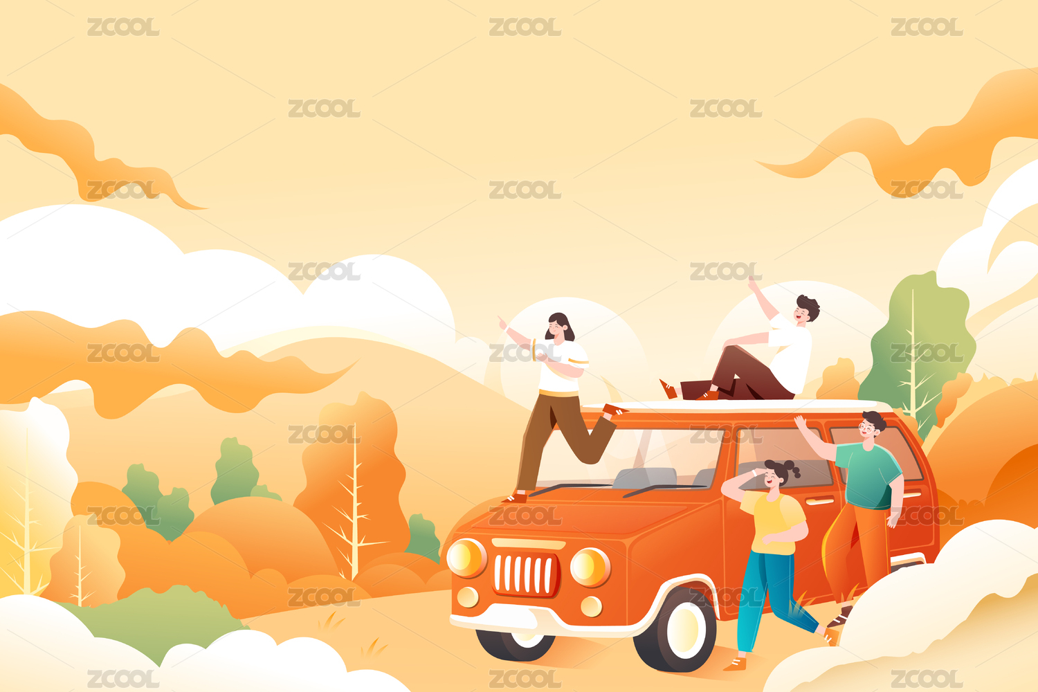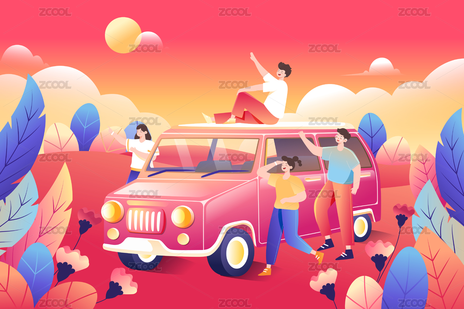 坐在车顶欣赏美景 多彩的郊外风景和朋友自驾游插画