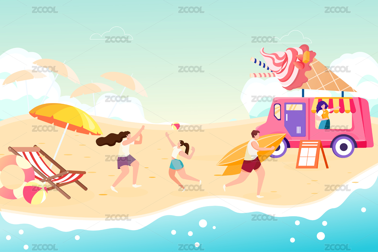 立夏节气美女假期旅游夏天海边避暑海滩插画