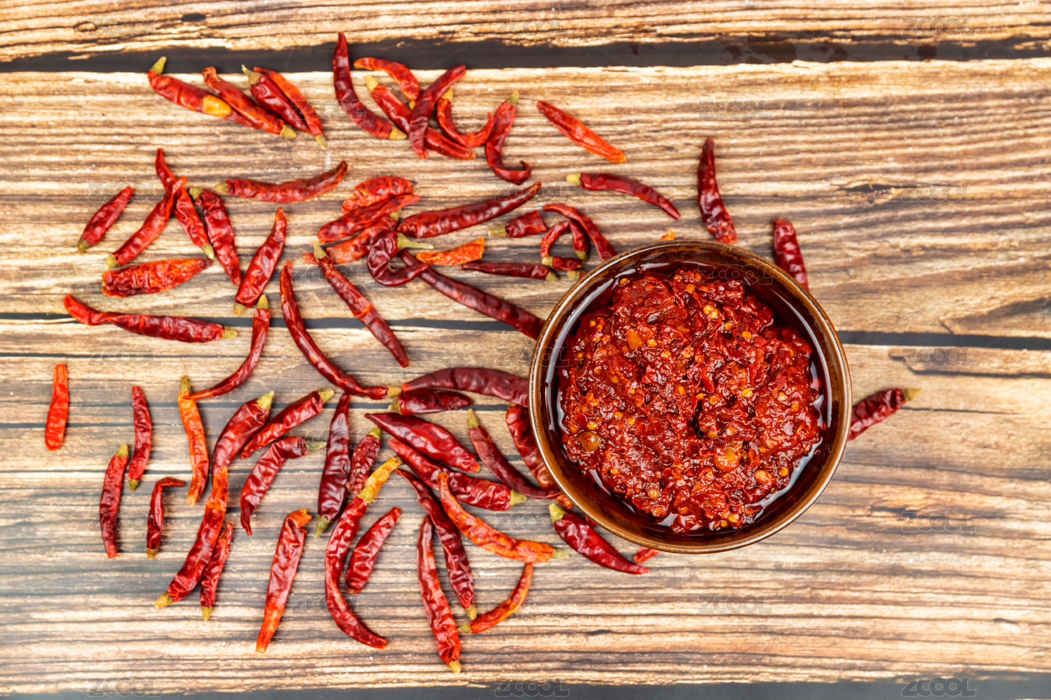 木纹桌面上的干辣椒与瓷碗盛放着的豆瓣酱