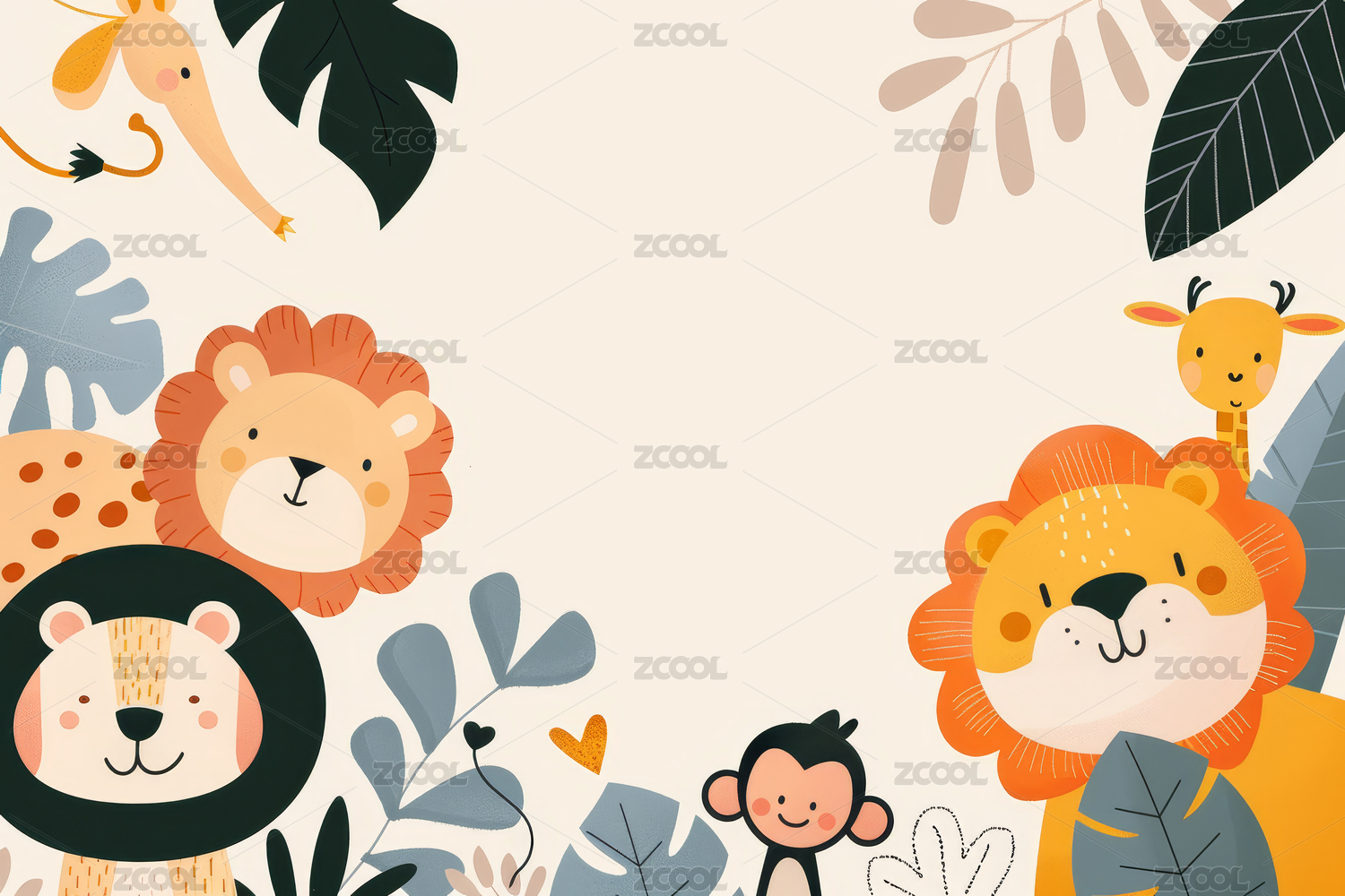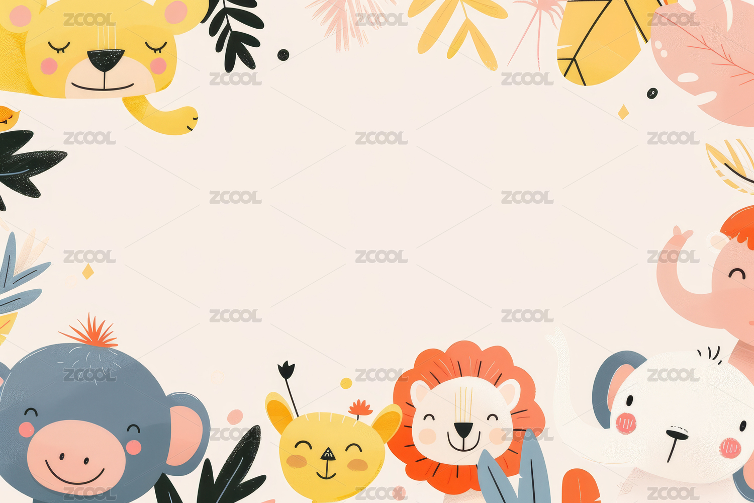 可爱卡通动物绿叶背景边框,儿童卡片明信片