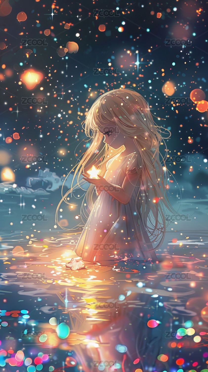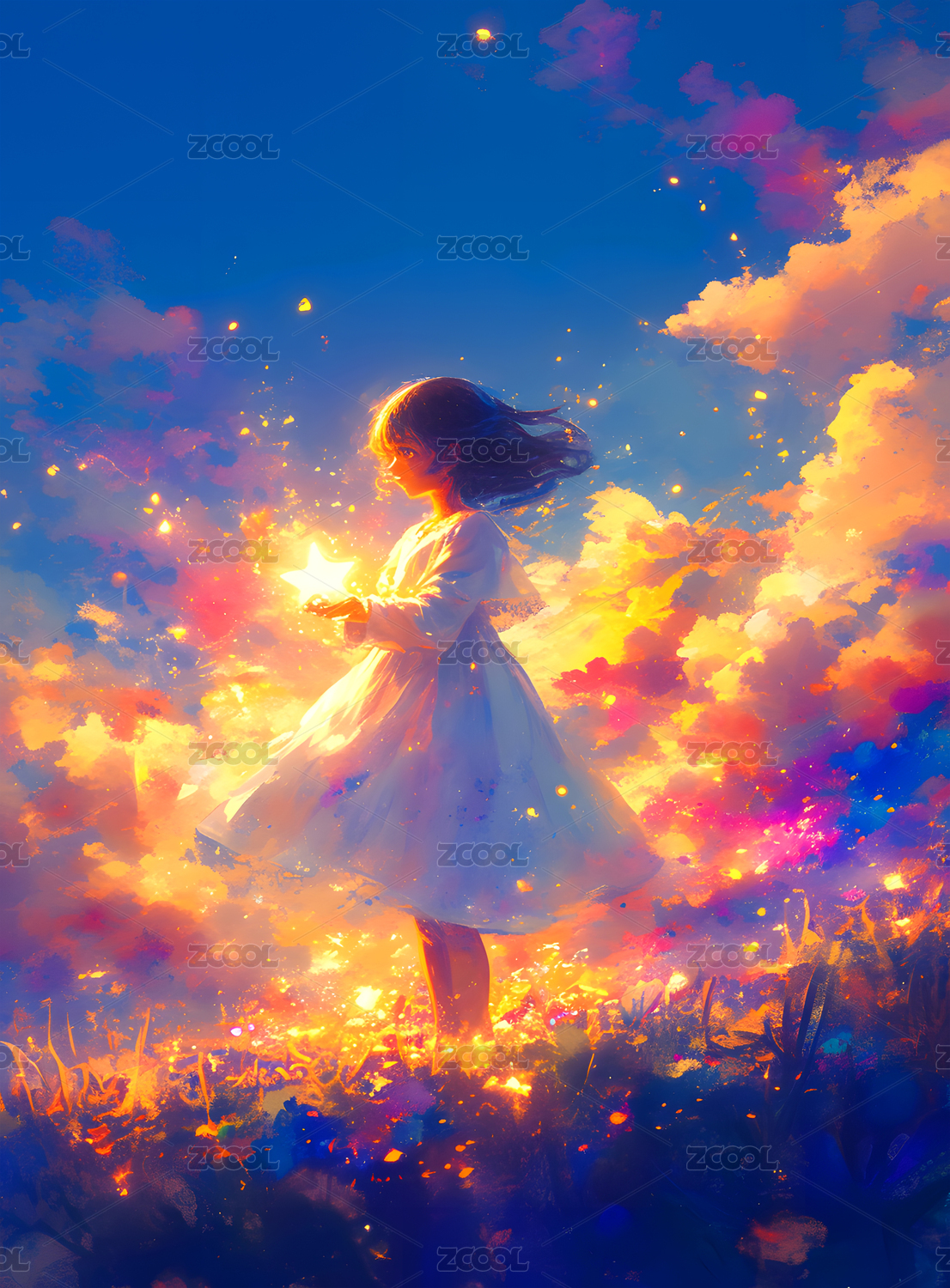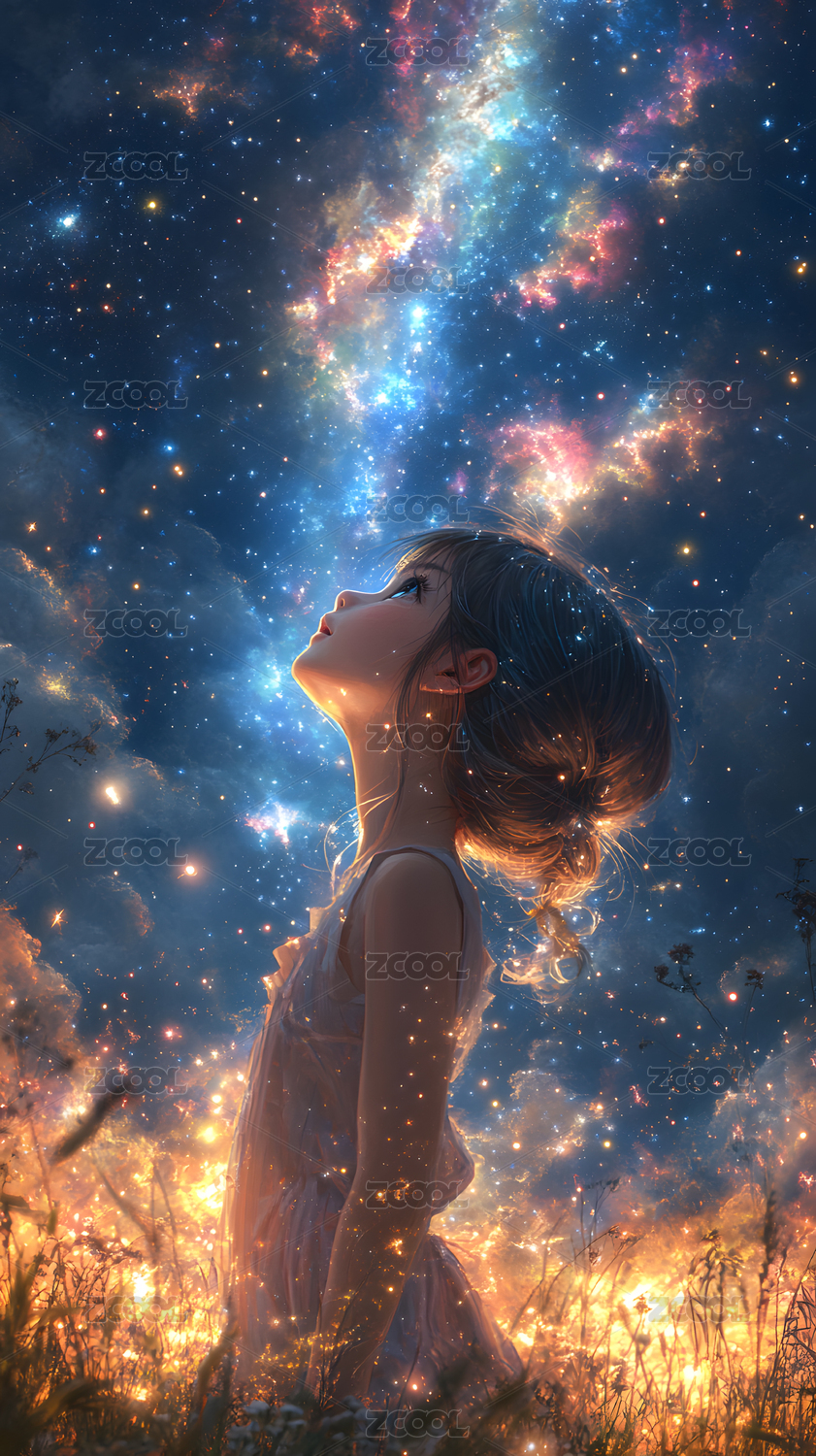 一个优雅的女生和色彩斑斓梦幻的夜晚