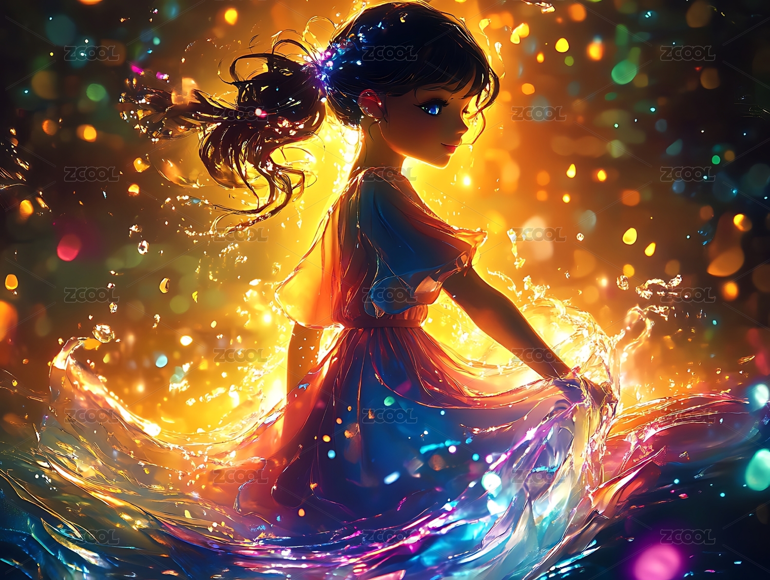 浪漫,唯美,氛围感,女生,美丽,漂亮,梦幻,色彩丰富,水花,虚拟乌托邦