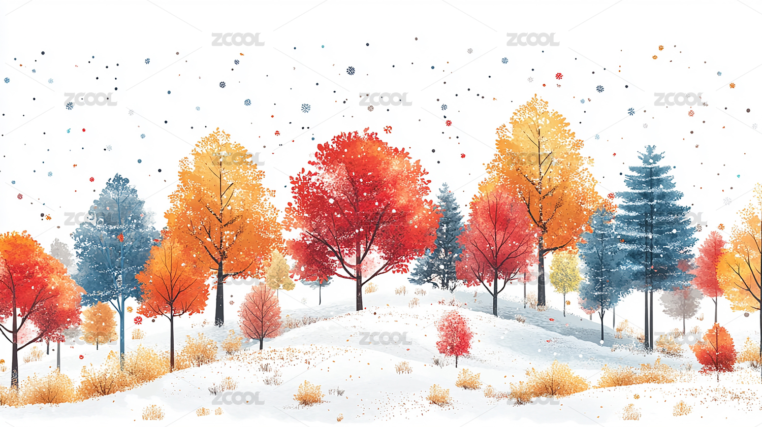 插画,冬天,冬季,雪景,下雪,积雪,山坡,风景,景色,霜降